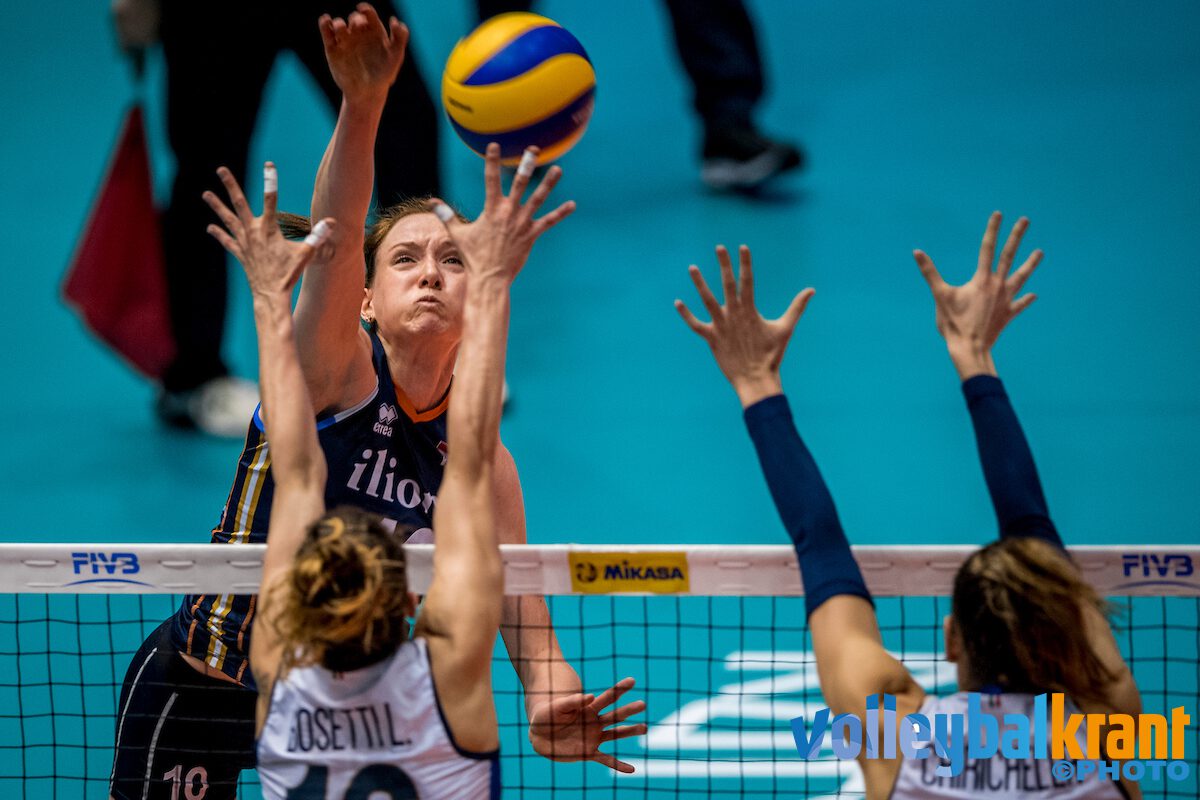 Nederland heeft in een wisselvallige wedstrijd het hoofd moeten buigen voor Italië. De Nederlandse ploeg had zelf moeite met scoren en ging mede daardoor in vijf sets onderuit: 25-18, 23-25, 25-19, 15-25 en 8-15.