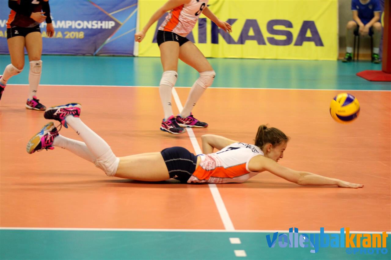 Nederland staat nu vierde (met 4 punten), Roemenië vijfde (met 3 punten) en Oekraïne zesde (met 0 punten). Die laatste twee spelen woensdag om 16.30u tegen elkaar. Als Oekraïne met 3-0 of 3-1 wint, staat de vierde plaats voor Nederland vast en kan het om de plaatsen 5 t/m 8 gaan spelen, ook al verliest Nederland de laatste poulewedstrijd. Die is tegen Turkije. Bij een andere uitslag van Oekraine-Roemenie zal Nederland punten moeten pakken tegen Turkije en dat zal niet makkelijk zijn. Turkije versloeg dinsdag verrassend Duitsland met 3-2. Turkije was met 18 aces serverend veel sterker, maar aanvallend waren beide teams aan elkaar gewaagd. Bij Turkije was passer/loper Sude Hacimustafaoglu de meeste waardevolle speelsters met zes aces en vijftien aanvalspunten. De wedstrijd tussen Nederland en Turkije begint woensdag om 19.00u
