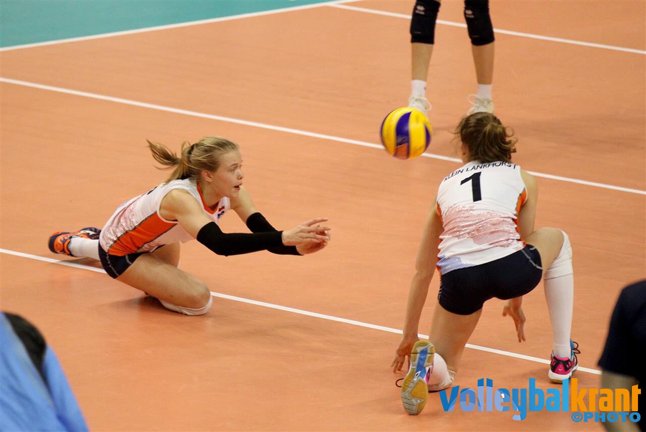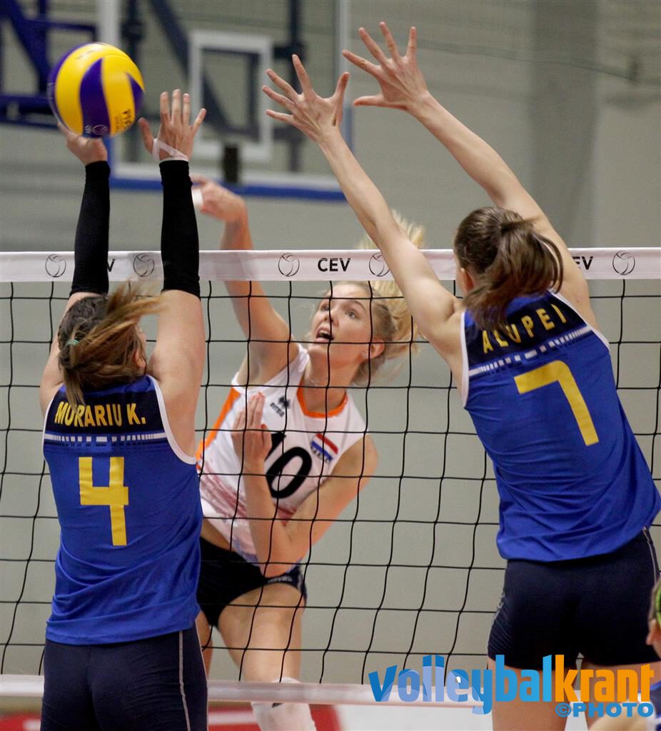 Coach Eelco Beijl startte met de volgende basisopstelling: Kim Klein Lankhorst, Jette Kuipers, Annemarie Venema, Anna Zijl, Iris Vos, Jolijn de Haan en libero Romy Brokking. In de eerste set nam Nederland een voorsprong bij 7-4, waarna het gelijk opging tot 10-10. Toen sloegen de Roemeense meisjes met hun opslag (zes aces in deze set) en hun aanval een voorsprong van vier punten en bouwden die uit tot een winst met 25-19. In de tweede set bouwde Roemenië direct een lichte voorsprong op: 4-1. Het werd daarna weer gelijk op 8-8. Nederland sloeg daarna toe: via 12-8 werd het 17-11. Nederland kon daarna naar setwinst lopen: 25-21. De meeste aanvalspunten werden in deze set gemaakt door Iris Vos (6) en Alexia Carutasu (6). In de derde set bracht Eelco Beijl Mirte van der Sluijs voor Jette Kuipers in en lag Roemenië eerst boven: 5-3, maar op 12-12 stond het weer gelijk. In een servicebeurt liep Nederland naar 17-12 en kon op basis hiervan de set winnen met 25-17. De meeste Nederlandse punten kwamen van Iris Vos (5 aanvalspunten), Mirte van der Sluijs (3 aces) en Annemarie Venema (3 blokpunten).