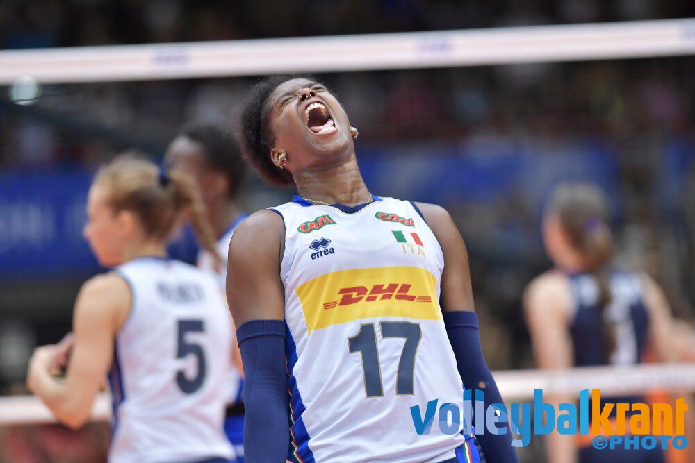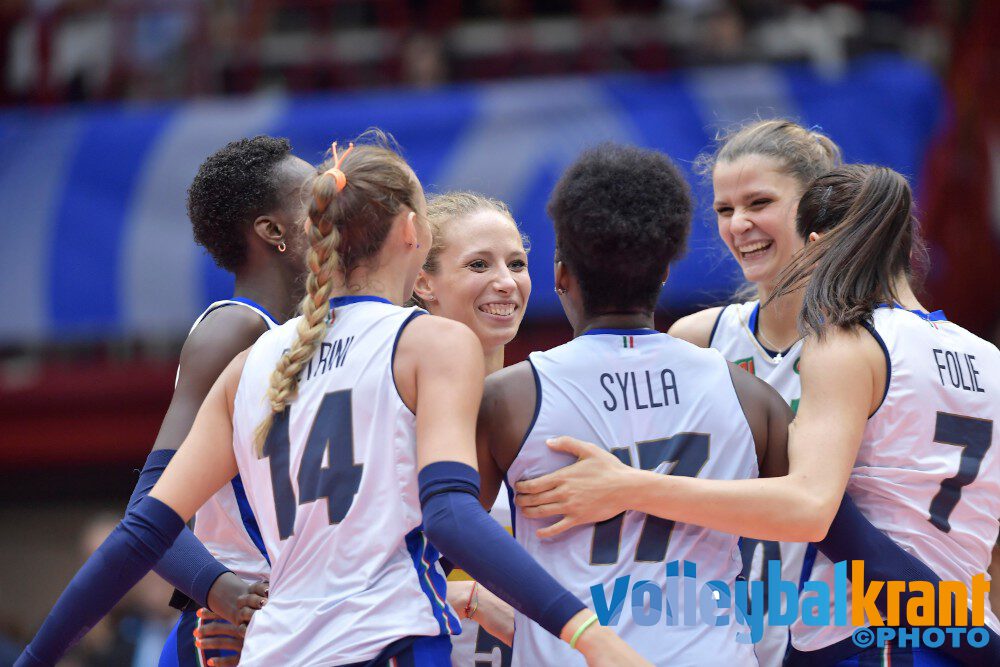 Het allesbeslissende duel ging voor Oranje weer van start met de vaste namen. Nederland had geen goede start en kwam met 4-1 achter. Vooral in de servicepass was de controle matig. Dat het op het scherpst van de snede ging, was snel duidelijk. Bij 8-4 waren er al drie challenges gebruikt, allemaal in het voordeel van Italië. De aanvallen van Nederland werden door zien, terwijl Egonu juist steeds goed in stelling gebracht kon worden. Al vroeg kwam Bongaerts op de plek van Dijkema. Daarna begon Oranje beter te volleyballen. De Kruijf pakte een paar goede blocks, terwijl Sloetjes gevaar stichtte vanaf de servicelijn (11-9). Met Daalderop voor Balkestein werd de stand 15-15. Eigen fouten van Oranje bracht Italië toch weer aan de goede kant van de score (19-16) en die voorsprong bleef staan. De eerste setpoints waren er op 24-20, maar na twee scores van Nederland greep Mazzanti naar de time-out. Even leek Nederland de comeback compleet te maken, maar het laatste setpoint was (via Egonu) aan Italië besteed.