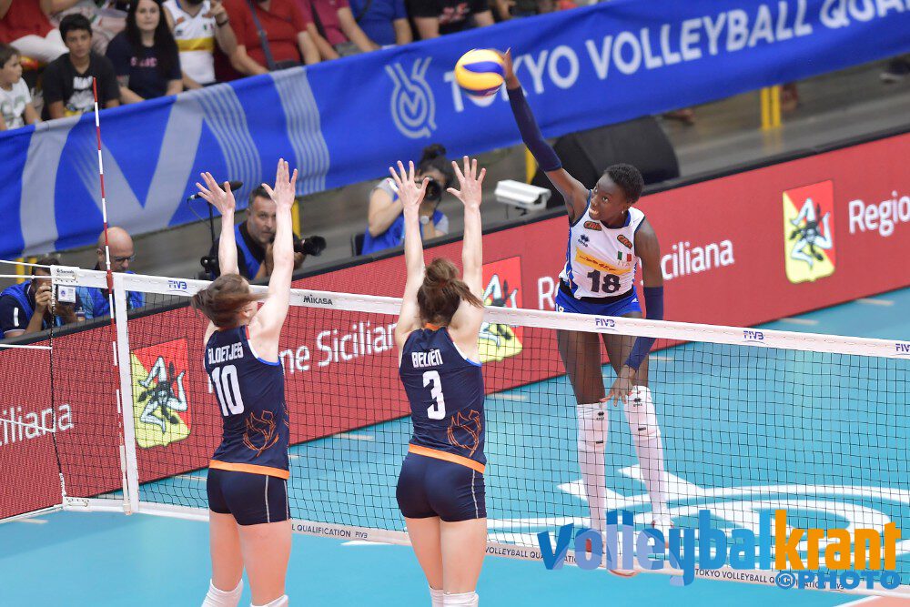 Nederland is de eerste kans voor een plek op de Olympische Spelen misgelopen door de nederlaag tegen Italië. De twee grootmachten vochten in een onderling duel uit wie het Olympische ticket zou bemachtigen en daarin kwam Nederland tekort: 25-23, 25-17 en 25-22.