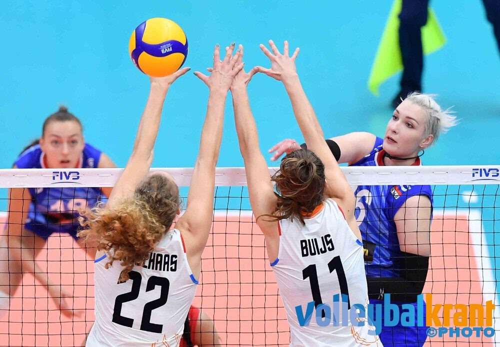 Nederland scoorde aanvallend nog wel meer punten dan Rusland (43 om 41), maar de tien killblocks en de hoge foutenlast wogen uiteindelijk het zwaarst. De Nederlandse ploeg maakte twee keer zoveel fouten als Rusland. Diagonalen Goncharova (16) en Sloetjes (14) werden topscoorders van de wedstrijd. Na deze nederlaag lijkt het podium voor Nederland uit zicht met nu een vierde plek achter China, Amerika en Rusland. Morgen staat Nederland voor een hele zware kluif op het programma als China, dat nog geen wedstrijd verloor, de tegenstander is. Die wedstrijd is om 08.00 Nederlandse tijd.