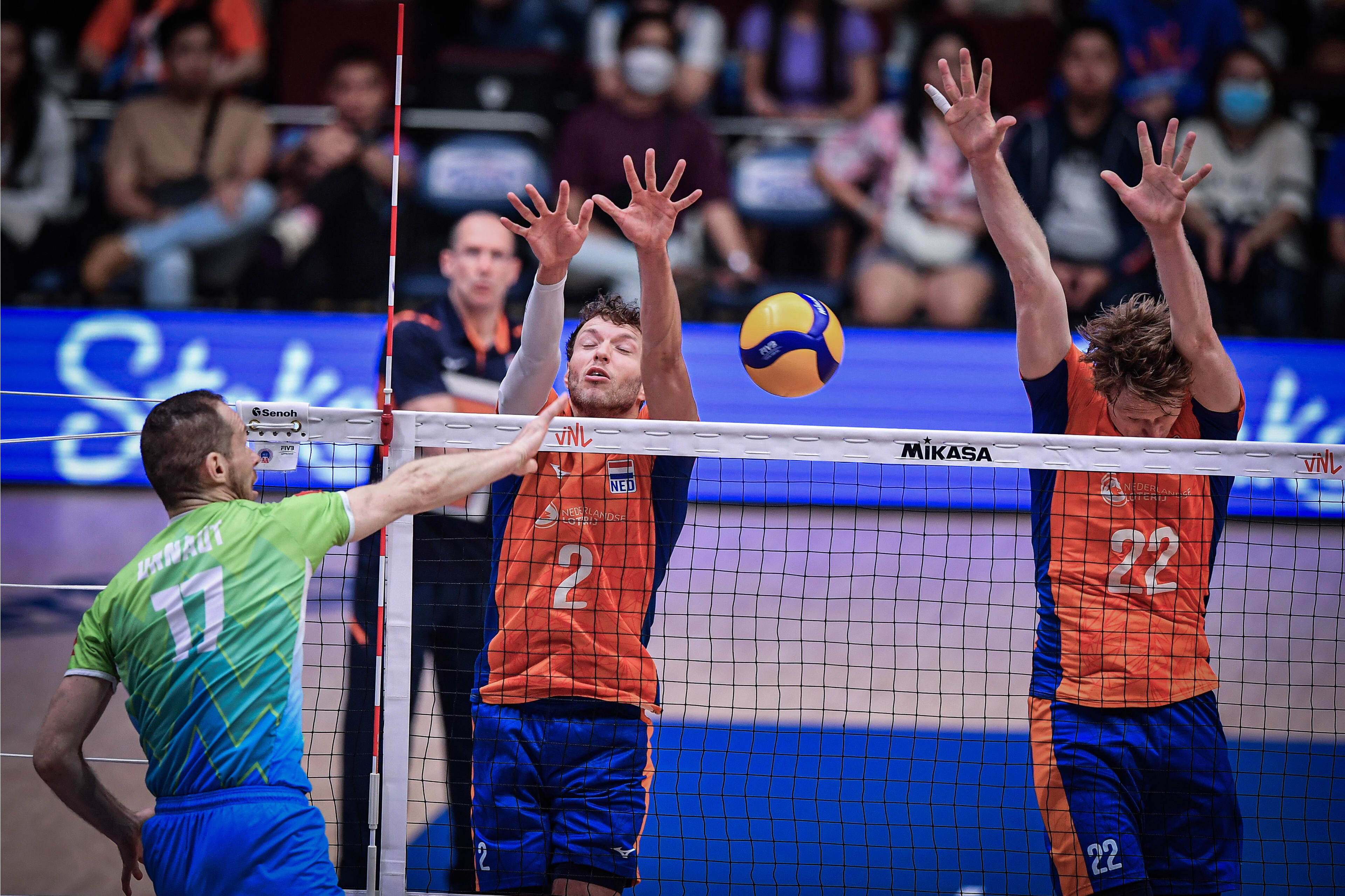 In set twee nam Oranje het heft in handen. Abdelaziz nam zijn team op zijn schouders en maakte meteen veel punten. De eerste ace van Nederland kwam van Van Garderen (9-12). Na weer een bom van Nimir (17-15) leek alles onder controle, totdat Urnaut aan service kwam. Abdelaziz stuitte op het blok en na een time-out van Piazza serveerde Urnaut twee aces en waren de rollen opeens compleet omgedraaid. Op 19-21 leek Slovenië het momentum te hebben, totdat Abdelaziz (net zoals tegen Japan) Oranje weer helemaal terug serveerde. Na twee aces en een tegenaanval zette hij Oranje op 23-21. Hij kreeg ook de kans op de 24-21, maar die bal ging uit. Het eerste Nederlandse setpunt werd weggewerkt en de landen streden vervolgens tot boven de 30. Na een fout van Van Garderen stond het Sloveense blok al bij Abdelaziz, die dit keer niet wist te passeren (30-32). Nederland wist vier setpunten niet te verzilveren.
