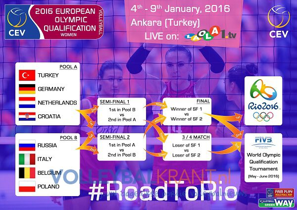 Alleen de winnaar van dit achtlandentoernooi plaatst zich rechtstreeks voor de Olympische Spelen in Rio de Janeiro. De nummers twee en drie krijgen in mei/juni 2016 een herkansing bij een kwalificatietoernooi in Japan. De andere Europese landen zijn uitgeschakeld voor de Spelen in Rio.