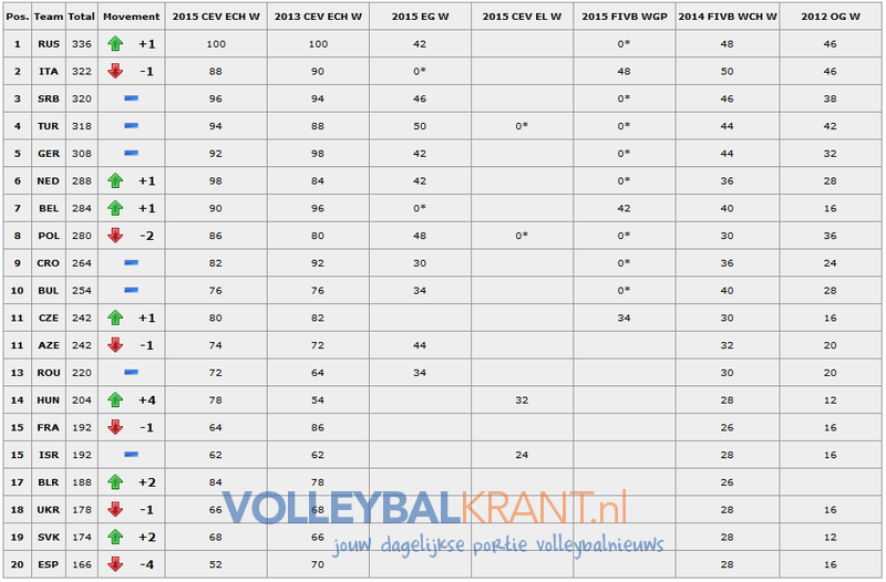 De Europese volleybalfederatie (CEV) maakte vandaag de Europese ranglijst bekend. Rusland lost Italië weer af als ranglijstaanvoerder, dankzij het prolongeren van de Europese titel. De Russinnen staan maar liefst veertien punten voor op Italië, dat Servië en Turkije nipt voor blijft.