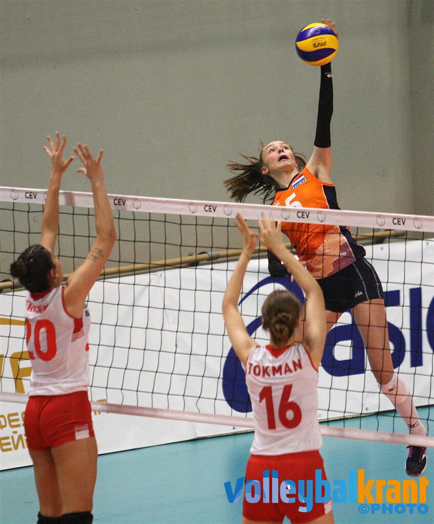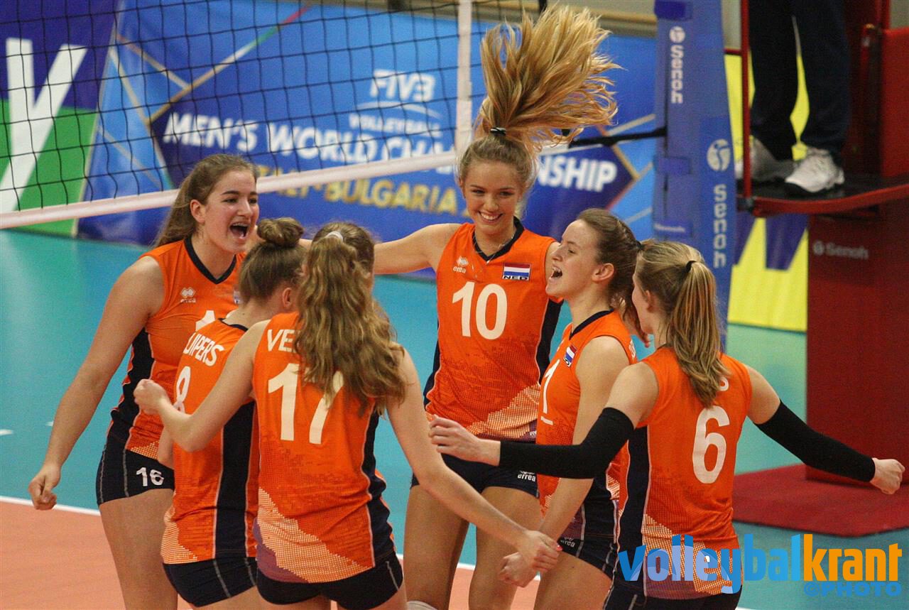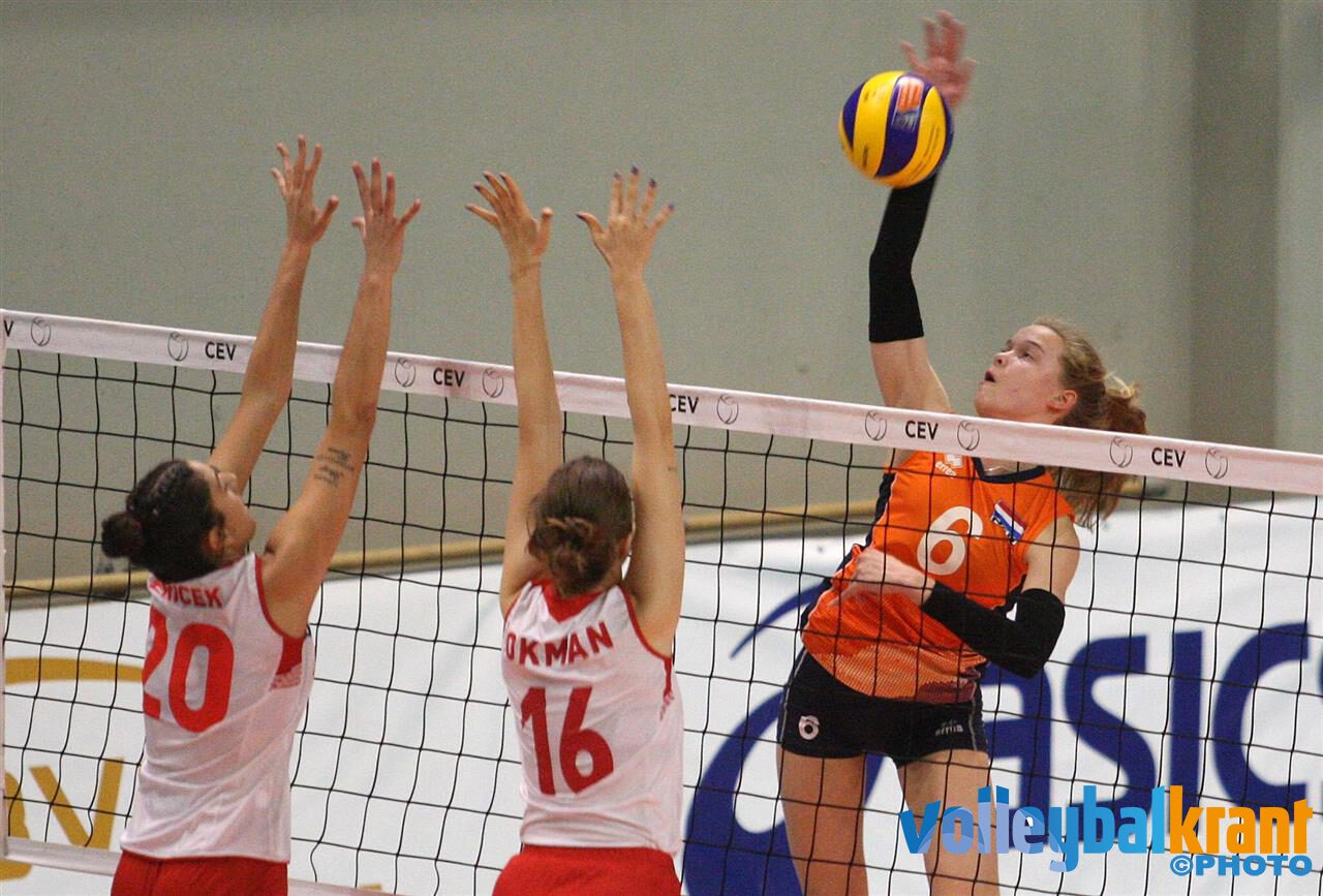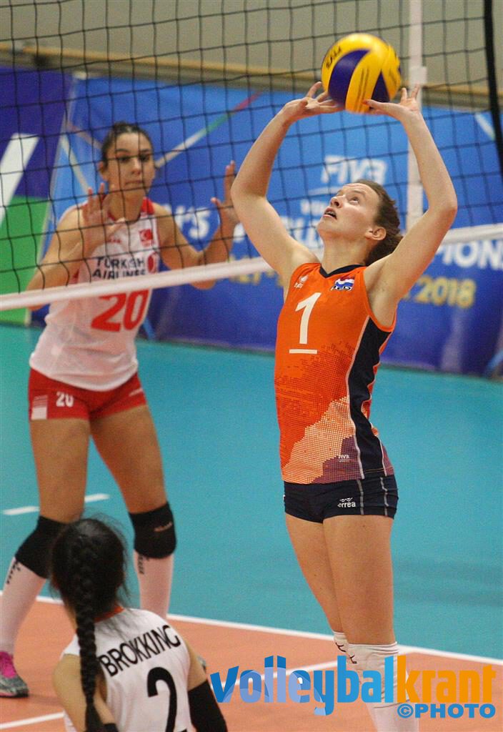 Coach Eelco Beijl startte met het volgende zevental: Kim Klein Lankhorst. Iris Vos, Annemarie Venema, Anna Zijl, Jette Kuipers en Jolijn de Haan en Romy Brokking. Nederland startte goed in de eerste set en kwam op lichte voorsprong:4-1. Op 6-6 zette Turkije in twee servebeurten een tussensprint naar 13-7 in. Nederland haalde terug naar 13-12. Het verschil bleef daarna klein, maar op 19-15 voor Turkije moest coach Eelco Beijl zijn tweede time-out gebruiken. Turkije bouwde de voorsprong verder uit, ondanks wissels aan Nederlandse kant. Het werd 21-25 voor Turkije, waarbij Jolijn de Haan de beste score had met vijf punten.