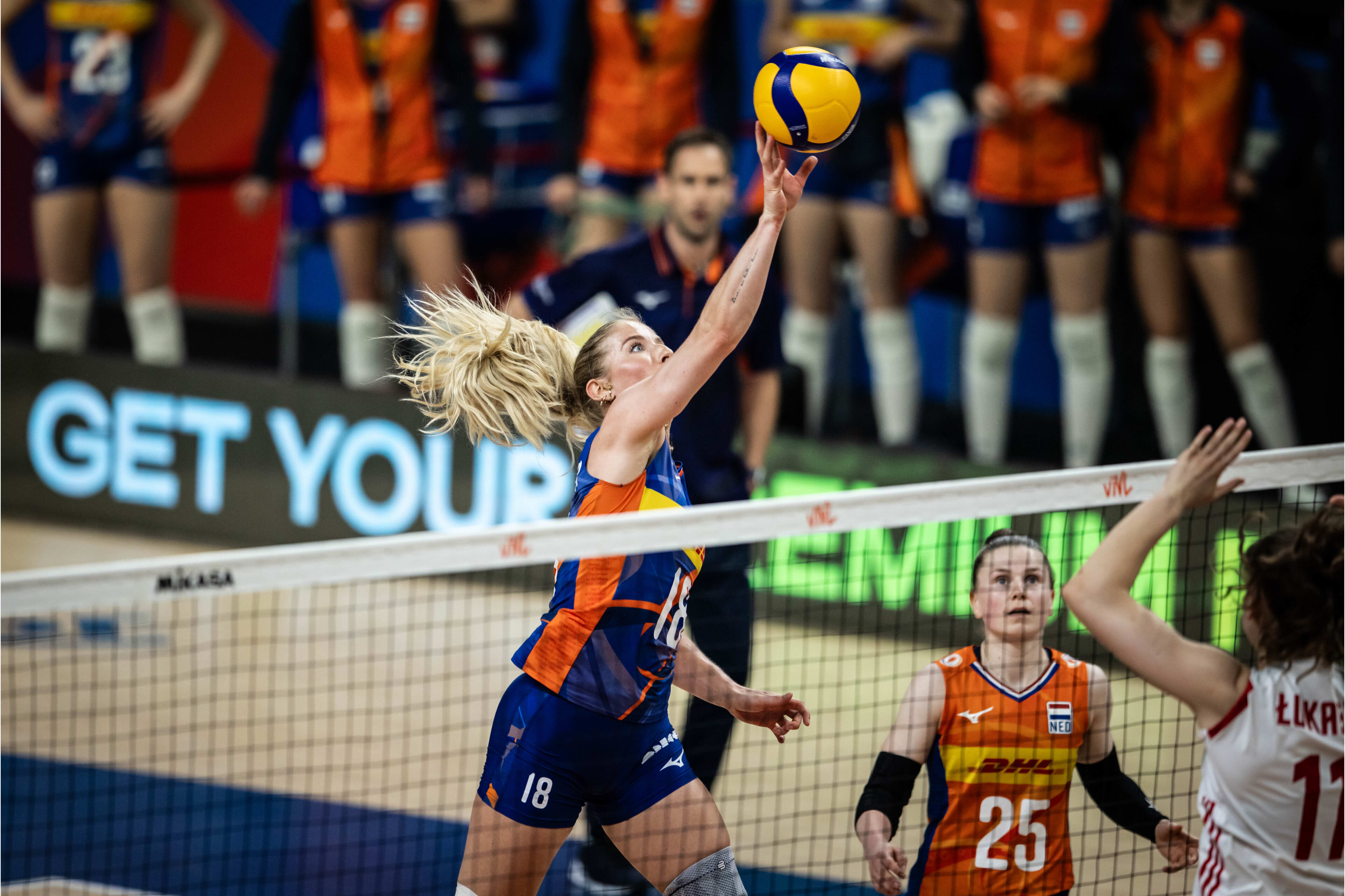 Bondscoach Koslowski koos voor één wissel in de basis ten opzichte van de verloren wedstrijd tegen Turkije. Eline Timmerman, die in het duel met Turkije goed inviel, had een basisplaats ten koste van Juliët Lohuis. De Poolse ploeg, onder leiding van Italiaanse bondscoach Stefano Lavarini, plaatste zich op het OKT vorige zomer al voor de Olympische Spelen. Desondanks is het met een zeer sterke selectie aanwezig in de VNL deze week, met als blikvangers de boomlange diagonaal Stysiak en midden Korneluk beide met een lengte van boven de twee meter. Nederland begon goed aan de eerste set, maar al snel kwam de klad in het aanvalsspel van Oranje. Alleen Anne Buijs (18 punten) en Marrit Jasper (12 punten) wisten regelmatig tot scoren te komen, maar op de andere posities lukte dat niet. Polen maakte daarentegen wel makkelijk de side-out en stichtte gevaar vanaf de servicelijn, waardoor de eerste set betrekkelijk eenvoudig door de Poolse dames gewonnen werd (20-25).