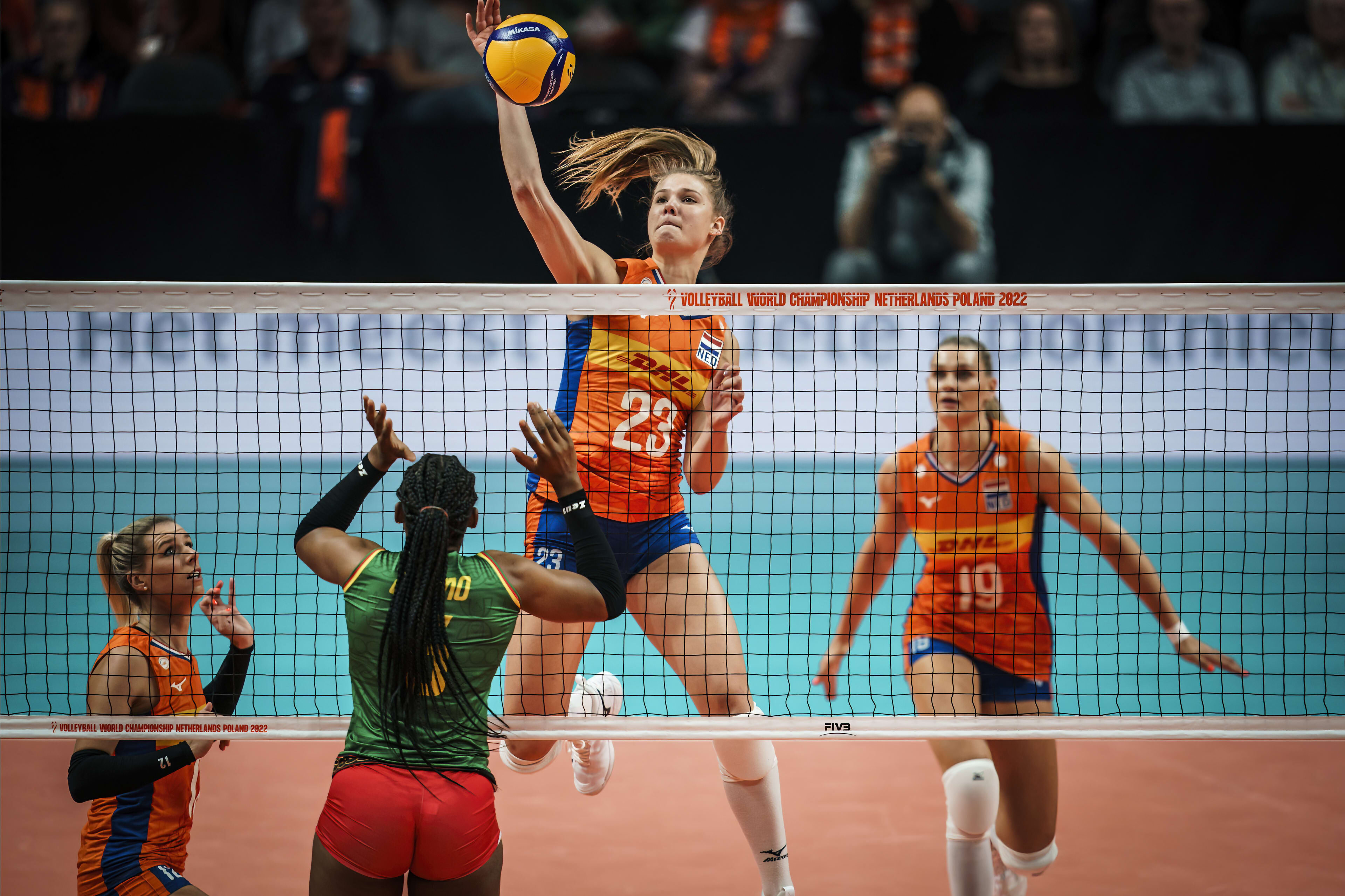Kameroen staat op de wereldranglijst vijf plaatsen hoger dan Kenia, maar dat verschil werd in de praktijk bijna niet zichtbaar. Alleen in de tweede set had Oranje het even lastig met de Kameroense tegenstander en maakte het zichzelf onnodig moeilijk door op vier punten achterstand te komen. Pas boven de twintig punten maakte Nederland in die set het verschil. Een killblock en ace aan Nederlandse zijde zorgden voor setpoint, dat met een nieuw killblock van Eline Timmerman direct verzilverd werd (25-20). In de andere sets was het verschil aanzienlijk groter en hoefde Nederland zich niet bovenmatig in te spannen. Met tien killblocks en negen aces deed Oranje goede zaken en won het uiteindelijk overtuigend in set één en drie (25-11, 25-13). Anne Buijs (11 punten) en Timmerman (10 punten, 4 killblocks) haalden de dubbele cijfers. Laura Dijkema en Elles Dambrink vielen in de eerste set in en in de laatste set mochten Tessa Polder, Fleur Savelkoel, Florien Reesink, Marrit Jasper en opnieuw Dambrink ook nog wat speelminuten maken.