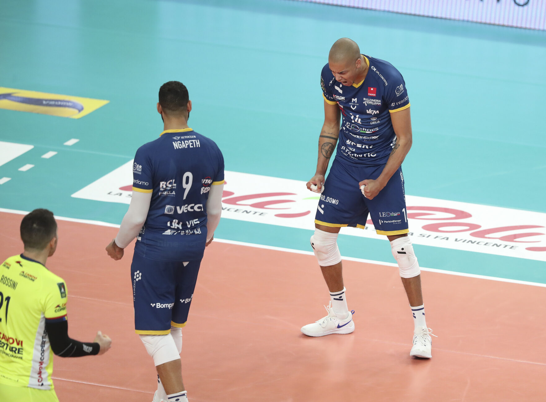 De twee meest succesvolle clubs uit de Italiaanse volleybalgeschiedenis stonden zondagavond tegenover elkaar. Het was vooral voor Modena om meerdere redenen een bijzondere wedstrijd. Na de uitschakeling in de beker en de CEV Cup was een overwinning noodzakelijk. Het was daarnaast een sleutelwedstrijd in de strijd om de derde en tweede plaats in de competitie. En het was voor Nimir Abdelaziz het wederzien van de club en de hal waar hij vorig jaar speelde, en uiteindelijk toch wel verrassend wegging. Ondanks 18 dagen zonder wedstrijd begon Modena sterk. Maar een 3-7 voorsprong was niet genoeg om de set te winnen (23-25). Ook in de tweede set was Modena lang de betere van de twee (o.a. 12-16), maar door eigen fouten liet het Trento terugkomen en werd ook set twee verloren. Gelukkig voor Modena ging de service vanaf set drie écht goed lopen en werd er meer verdedigd. De vier directe aces en een goede tegenaanval zorgde voor de 2-1 (19-25). In set vier stoomde Modena door en noteerde Abdelaziz o.a. zijn zesde ace. Daarnaast wist de diagonaal ten opzichte van de eerste twee sets nu wel uitstekend het blok te omzeilen (18-25). Met ongewijzigde opstellingen begonnen beide teams aan de vijfde set, waarin Modena weer snel op voorsprong kwam (3-6 en 6-12). Trento kwam op wonderbaarlijke manier nog op 13-14, maar gelukkig was het Abdelaziz die na een geblokte aanval van 'Ngapeth het verlossende punt scoorde. Modena pakte zo twee belangrijke punten voor het klassement en staat met één wedstrijd minder nu nog maar één punt achter Trento. Nimir Abdelaziz speelde een ijzersterke pot en werd terecht MVP. Hij scoorde 28 punten (51% aanval, 7 (!) aces en een killblock). Maarten van Garderen kwam drie van de vijf sets in het veld om het achterveld te versterken.