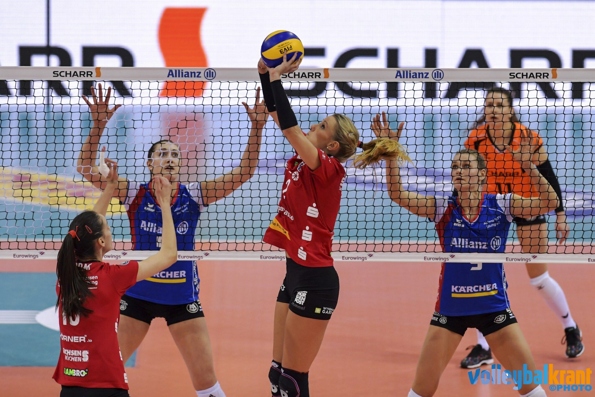 Dresden had tot zondag, na een 3-2 nederlaag in de openingswedstrijd van het seizoen bij Potsdam, geen duel meer verloren: niet in de competitie, niet in de beker en niet in Europees verband. Een belangrijke rol in die zegereeks was weggelegd voor de Finse diagonaal Piiha Korhonen, met afstand de meest scorende speelster in de Bundesliga. Iets wat ook juist haar belang voor Dresden onderstreept. En juist die Korhonen, goed voor bijna 20 punten per duel, ontbrak zondag bij de koploper in de topper bij de nummer twee van de ranglijst. Ze was geveld door een maag-darminfectie.