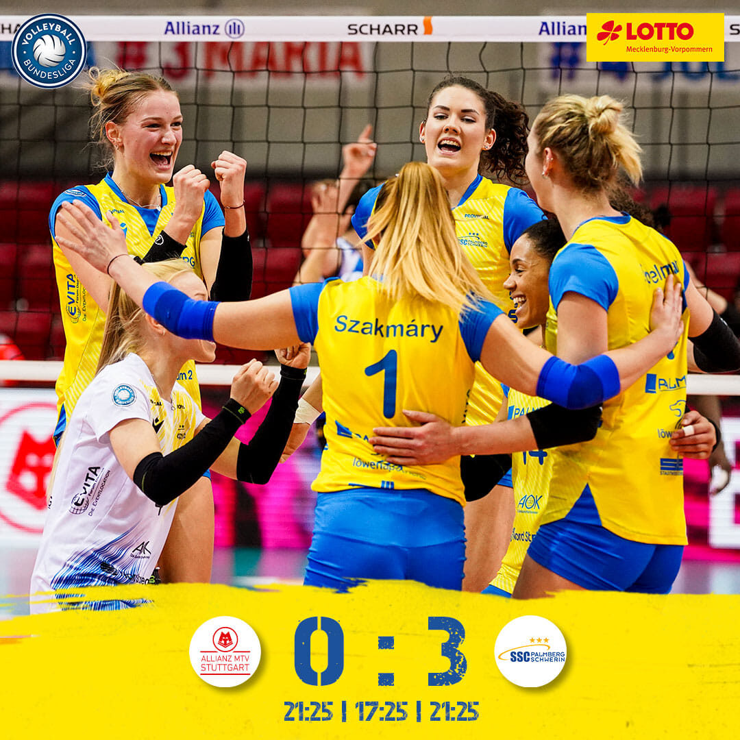 Na de 0-3 nederlaag donderdag van SSC Schwerin tegen Dresdner SC lukte het de ploeg van Femke Stoltenborg en Nicole Oude Luttikhuis gisteren, tegen koploper MTV Stuttgart (met Juliët Lohuis en Hester Jasper) flink te stunten. Met de 21-25, 17-25 en 21-25 had Stuttgart niet veel in te brengen. Hester Jasper liet zien weer op de weg terug te zijn met goede invalbeurten in twee sets. Lohuis kwam aanvallend niet tot scoren, maar wist met het blok en de service toch nog 4 punten bij elkaar te sprokkelen.
