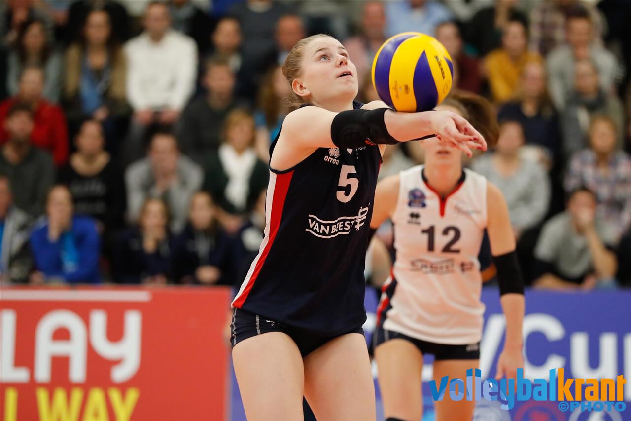 De basis bij Sliedrecht bestond uit Vossen, van Rooijen, Hullegie, Savelkoel, Thijssen, Ghijssen-Jans en Reesink. In het begin van de set liggen de teams qua stand niet ver uit elkaar, maar is het Béziers wat bij de tweede technische time-out toch een gaatje heeft geslagen (11-16). Dat verschil blijft tot het einde van de set staan, Sliedrecht komt nog wel tot de 20 punten maar de set gaat naar de Franse ploeg met 20-25. Set twee biedt eerst hetzelfde spelbeeld, Béziers bouwt langzaam aan een ruime voorsprong. Sliedrecht vecht zich wel terug van de 11-21 achterstand, maar verder dan 21-25 komt het niet.