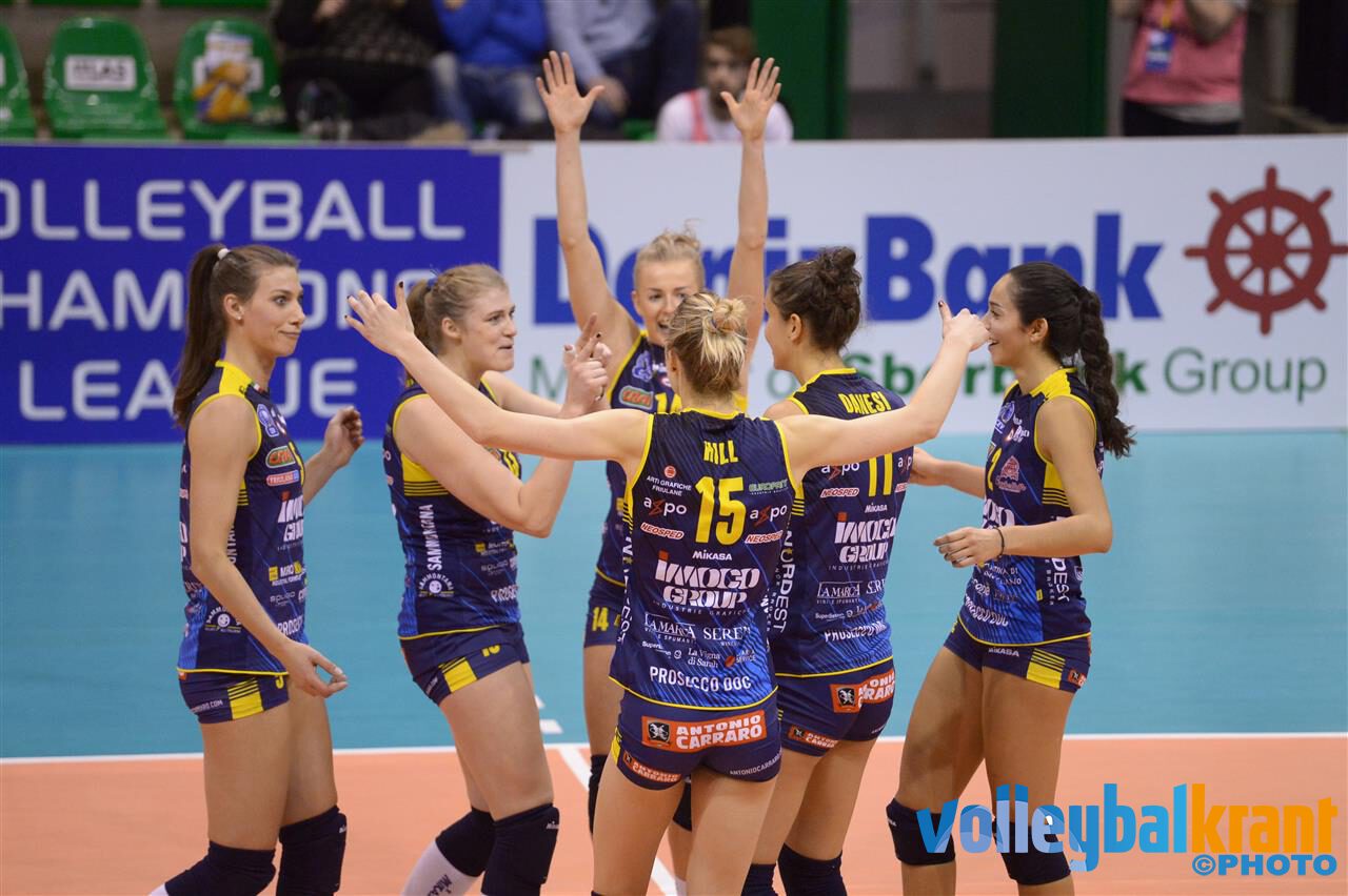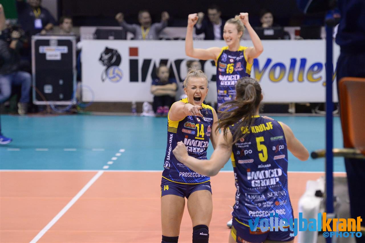 In poule B zitten Celeste Plak met Novara en Robin de Kruijf met Conegliano ingedeeld. Nadat ze vorige week in de competitie al tegen elkaar speelden (lees hier), mochten de teams nu al tegen elkaar in actie komen in de Champions League. Het werd een vervelende avond voor Novara dat, behalve in set drie, weinig had in te brengen tegen de ploeg van Santarelli. Alleen set drie wist het team van Plak winnend af te sluiten, de andere sets waren ruim (25-13, 25-18 en 25-14) voor de thuisploeg. Met uitblinkers Samanta Fabris (18 pt) en Robin de Kruijf (16 pt) gaat Conegliano nu aan kop in de poule des doods. In de andere wedstrijd van deze poule werd Fenerbahçe in de eerste set verrast door Agel Prostejov, maar stelde daarna vrij eenvoudig orde op zaken. Polina Rahimova scoorde 26 keer voor de Turkse club.