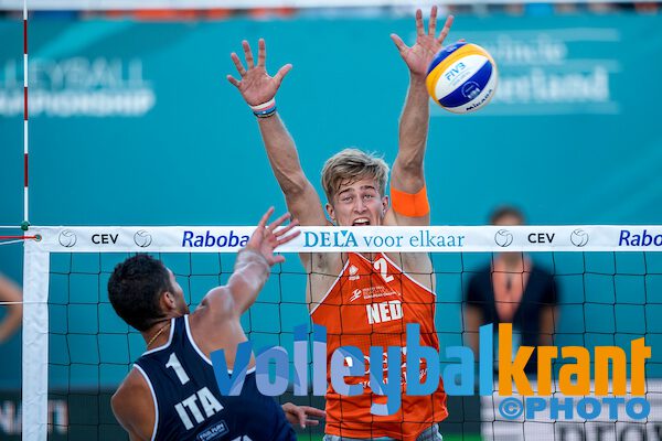 De wedstrijd blijft in evenwicht, maar Nederland blijft elke keer aan de goede kant van de score. Met name van de Velde heerst aan het net, hij noteert alleen in de eerste set al zes killblocks. Richting het einde van de set krijgt het publiek prachtige lange rally’s voorgeschoteld met mooi verdedigend werk van beide partijen. Een afstemmingsfout aan Italiaanse zijde zorgt voor de 21-18 voor Boehlé/van de Velde.