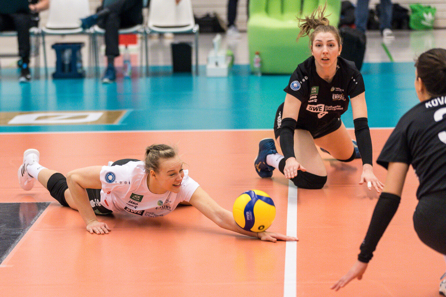 Toch had Schwerin (met zowel Oude Luttikhuis als Femke Stoltenborg in de basis) nog redelijk wat moeite om hekkensluiter Erfurt van zich af te schudden. De 1ste set werd nog redelijk makkelijk binnengehaald. Een 11-9 achterstand werd omgebogen tot een voorsprong van 13-19 en met 18-25 was de set binnen. De 2e set ging al een stuk moeizamer. Beide ploegen hielden elkaar tot het eind in evenwicht, maar Schwerin trok opnieuw aan het langste eind, 23-25.