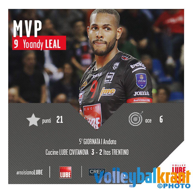 Zoals ook Perugia een grote investering heeft gedaan om Wilfredo Leon te halen, is het Civitanova dat met Yaondry Leal, Robertlandy Simon en Bruno Rezende een sterrenteam heeft geconstrueerd. Het begin was echter wankelend en na de afgang tegen Perugia was het tijd voor een reactie. Die kwam er gelukkig. In een wedstrijd tegen Trento waarin de bezoekers zowel 0-1 als 1-2 in sets voor kwam was het toch Civitanova dat opgelucht adem kwam halen. In de vijfde set werkte het zelfs een 3-6 achterstand weg om vervolgens de broodnodige overwinning te pakken. Leal werd uiteindelijk ‘Man of the match’ met 21 punten (waarvan 6 aces). Maarten van Garderen begon aan de kant van Trento wederom in de basis en scoorde 6 punten in twee sets waarna Aaron Russell zijn plek innam na terug te zijn van één opgelopen virus. Trento trok dus net aan het kortste eind maar neemt toch een kostbaar punt mee naar huis. In Civitanova lijkt de rust wat te zijn teruggekeerd en zal coach Medei dus nog altijd op de bank zitten de volgende wedstrijd.