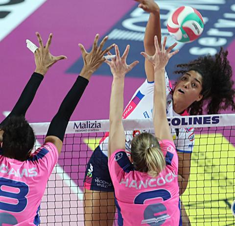 Conegliano zit met één wedstrijd minder gespeeld nog altijd in de achervolging om de koppositie. Tegen Club Italië werd de volle buit binnengehaald, al moest de 1ste set nog wel met 23-25 aan de bezoekers worden gelaten. Dat setverlies werkte als een duidelijke waarschuwing, want in het vervolg kwam de ploeg van Robin de Kruijf niet meer in gevaar: 25-21, 25-15 en 25-21. De Kruijf speelde weer een prima wedstrijd en scoorde 16 punten voor haar ploeg. Alleen Kimberley Hill scoorde met 19 punten meer dan de Nederlandse middenaanvalster.