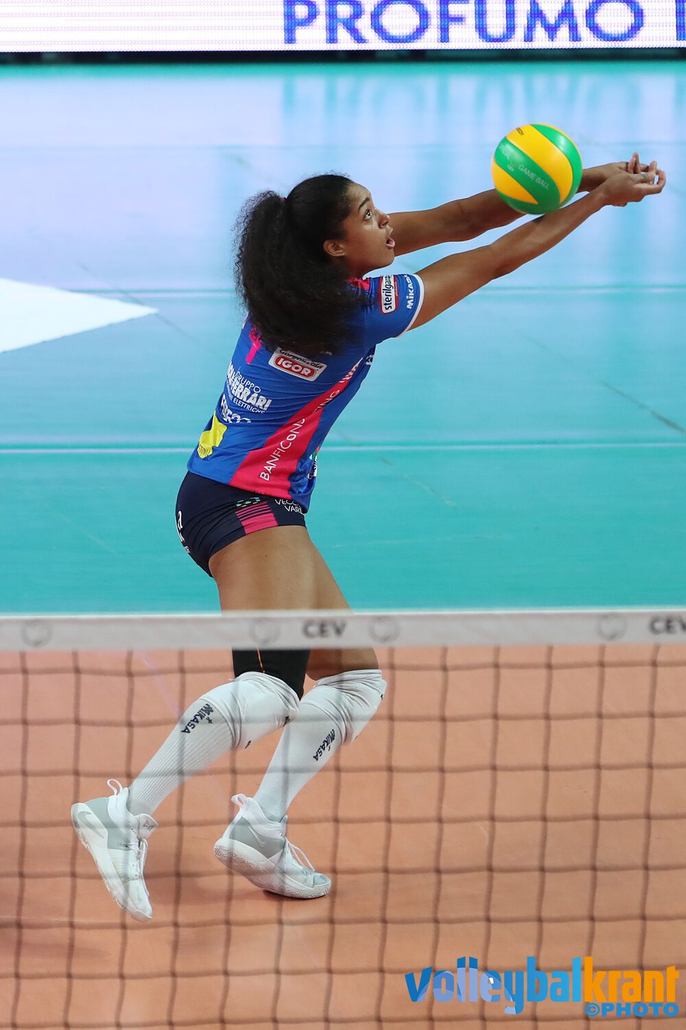 Verrassend genoeg was niet Paola Egonu de meestscorende speelster van de avond, die eer viel te beurt aan de passer-loopster die diagonaal van Plak in het veld stond, Paula Nizetich (hierboven glijdt ze de boarding in bij het redden van een bal). Zij liet 16 punten noteren.