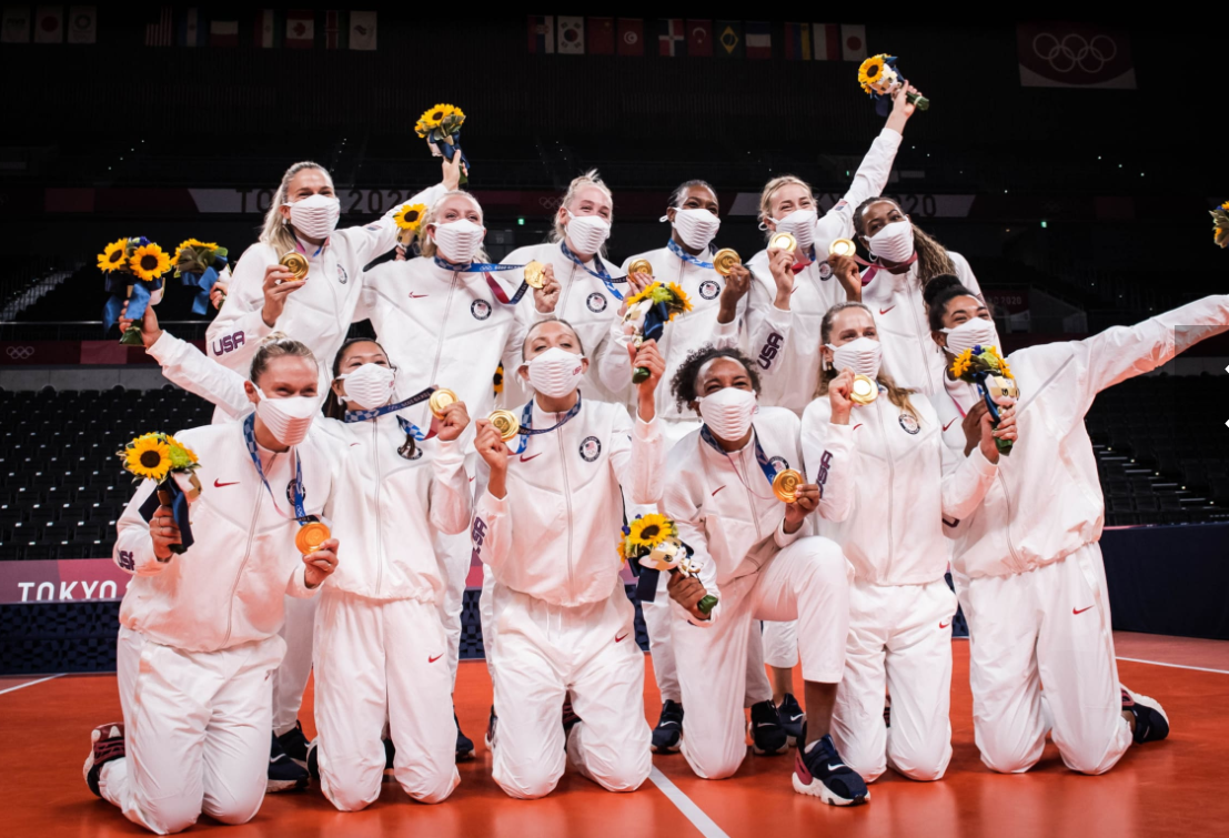 Ook Amerika wist voor het eerst in de historie (bij de vrouwen) een gouden Olympische medaille te winnen. Tijdens de groepsfase speelde Amerika nog twee keer 3-2 en verloor het van Rusland, maar vanaf de kwartfinales waren de Amerikaanse dames oppermachtig. De Dominicaanse Republiek en Servië werden in de kwart- en halve finale zonder setverlies aan de kant gezet. En ook in de finale was het team van Karch Kiraly duidelijk sterker dan Brazilië. Na vijf podiumplekken (drie daarvan in de laatste drie edities) wist het nu in Tokio eindelijk het goud te veroveren. Jordan Larson werd MVP. Coach Karch Kiraly won zijn vierde Olympische medaille. Na drie gouden plakken als speler (twee in de zaal en één op het strand), won hij nu ook als coach de allerbelangrijkste sportmedaille.