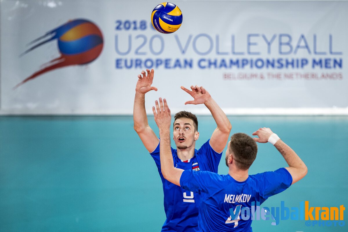 In de eerste set kwam Jong Oranje op voorsprong door aanvalspunten van Sjors Tijhuis en Bennie Tuinstra en Sjors Tijhuis blokte de 2.17 lange Russische diagonaal af, waarna Bennie Tuinstra de Russische passer/loper af. Dat waren beide de topscorers van de Russen tijdens de poulewedstrijden. In de rest van de set waren er erg kleine verschillen, maar op het eind werd het toch 23-25. Jong Oranje was echter niet aangeslagen, want ook David Bes blokte de Russische diagonaal. Daarna volgde een ace van Daan Streutker en op 5-3 een geweldige rally die Nederland won. De voorsprong werd daarna steeds groter en bedroeg op 18-12 zes punten. Rusland kwam terug tot 18-17, maar door 2 blokpunten van Sjors Tijhuis en 2 aanvalspunten van de ingevallen Nimo Benne werd het toch 25-20 voor Jong Oranje.