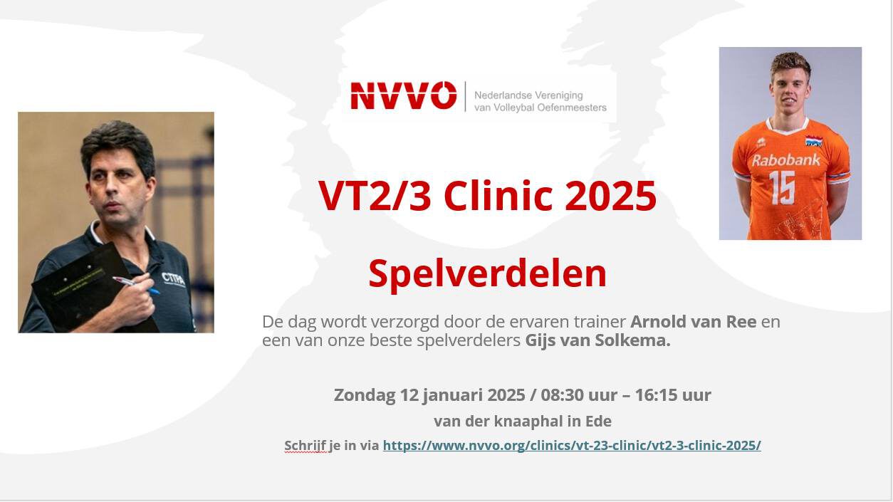 Op zondag 12 januari 2025 zal de jaarlijkse NVVO VT 2/3 Clinic gehouden worden. In de Van der Knaaphal in Ede is het onderwerp spelverdelen. Sprekers zijn Arnold van Ree en Gijs van Solkema. Schrijf je nu in!