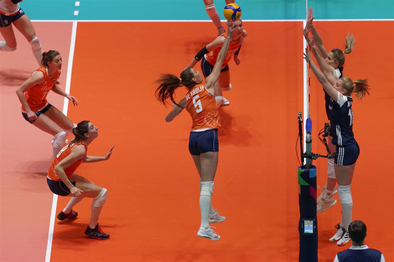 Bondscoach Jacek Nawrocki van Polen had zijn huiswerk kennelijk goed gedaan. Waren Robin de Kruijf en Nika Daalderop in de eerdere poulewedstrijden nauwelijks af te stoppen, het Poolse blok had vanavond in een vol Omnisport tegen de twee veelvuldig succes. De Kruijf scoorde aanvallend maar 2 punten en voegde daar met killblocks 4 punten aan toe. Bij Daalderop stopte de teller op 11, maar met een aanvallend scoringspercentage van 28% zal ze zelf zeker niet tevreden zijn.