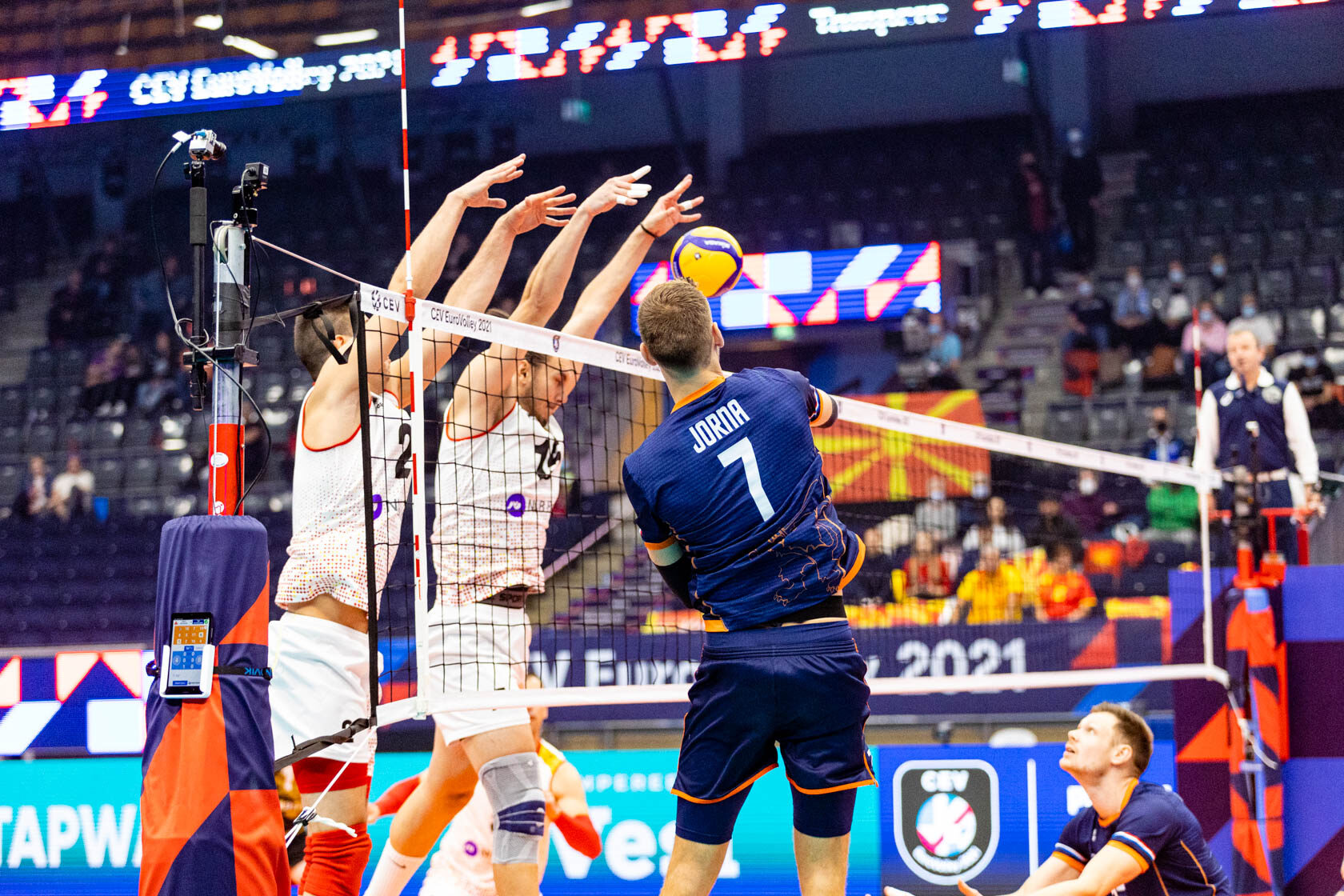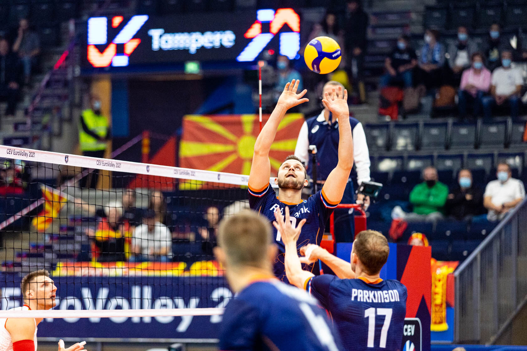 De Nederlandse mannen liepen door prima aanvalsspel in de eerste set al snel uit naar een 8-4 voorsprong. Noord-Macedonië reageerde echter goed en kwam terug tot op een punt, maar het was Parkinson die met een blok de 13-13 voorkwam. Dat was een belangrijk punt, want vanaf toen begon het echt te draaien. Ter Maat scoorde zijn ballen en via Jorna werd het 17-13. Die voorsprong van vier punten werd tot het eerste setpunt (24-20) behouden. Een fout van de spelverdeler aan de andere kant van het net betekende via 25-20 setwinst voor Oranje.