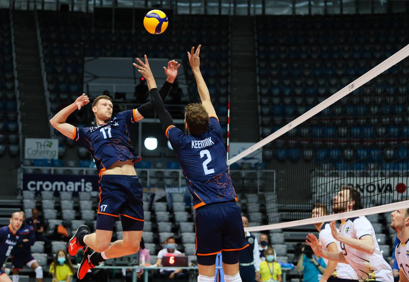 Nederland begon in de volgende opstelling: Wessel Keemink, Wouter ter Maat, Thijs ter Horst en Gijs Jorna, Michael Parkinson en Luuc van der Ent en libero Just Dronkers. Na een sterke wedstrijd gisteren had Ter Maat er al snel twee punten inliggen, maar Zweden bleef netjes aanklampen (9-9). Het was Keemink die met zijn servicebeurt voor het eerste serieuze gat zorgde. Hij bracht Zweden in moeilijkheden en Gijs Jorna verzilverde twee rallykansen waardoor Nederland vijf punten afstand nam. Na uitstekend blokkerend werk van vooral Van der Ent (2 directe killblocks) was geloof bij Zweden al snel weg (25-17).