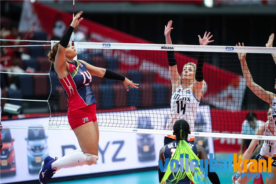 Toen Oranje na winst in de sets 3 en 4 (27-25 en 25-18) langszij kwam leek het in deze wedstrijd toch nog goed te komen. Niets was minder waar. Bethania de la Cruz begon met serveren en stopte daar pas mee toen de 0-11 op het scorebord stond. Oranje kreeg de servicepass maar niet onder controle en ging hard onderuit. De ploeg van Jamie Morrison zakte door deze 5e nederlaag naar de 6e plaats op de ranglijst. Als Brazilië morgen van Rusland verliest en Nederland wint van Japan, klimt Oranje alsnog naar de 4e plaats.