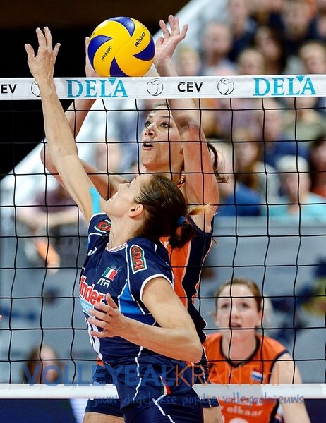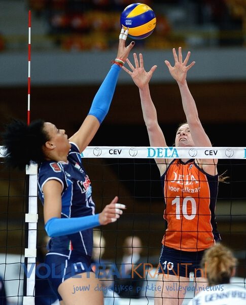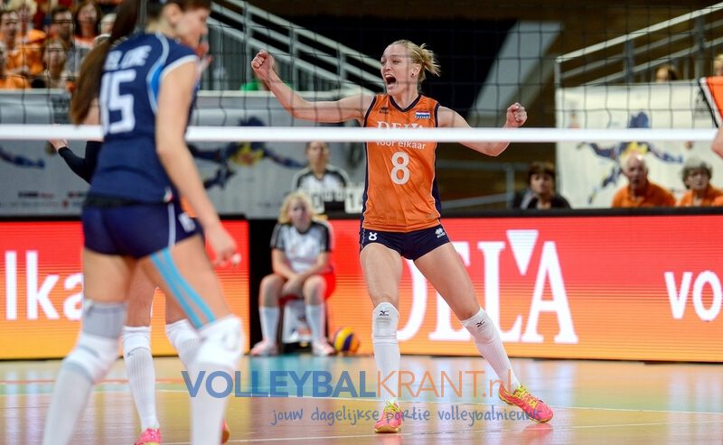 Na 25-15 setwinst schakelde Diouf een tandje bij, maar zij was ook de enige die erin slaagde gevaar te stichten bij Nederland. De 2,02 meter lange diagonaal zette Italië nog wel op voorsprong, maar Laura Dijkema had met Balkestein-Grothues en Sloetjes twee hete hangijzers in het vuur. Daarnaast was de Oranje aanvoerster met haar service een plaaggeest voor de Italiaanse pass. De Italiaanse bondscoach probeerde met de nodige wissels het tij te keren, maar Nederland raakte niet van zijn stuk en denderde door naar een 25-18 setwinst.