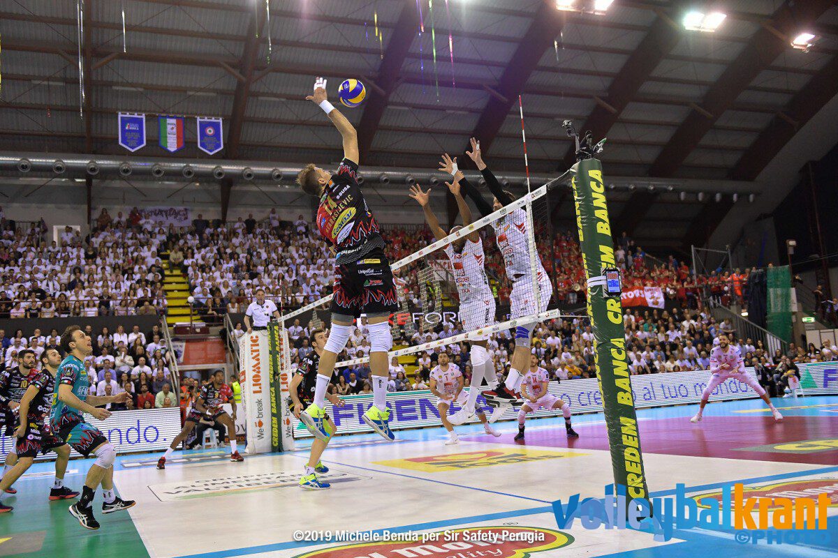 In de eerste finalewedstrijd in de strijd om de Italiaanse 'scudetto' heeft Perugia een flinke tik uitgedeeld aan Civitanova. De thuisploeg was heer en meester in een bijna beschamende wedstrijd. Het werd 3-0 (25-13, 25-18 en 25-18).