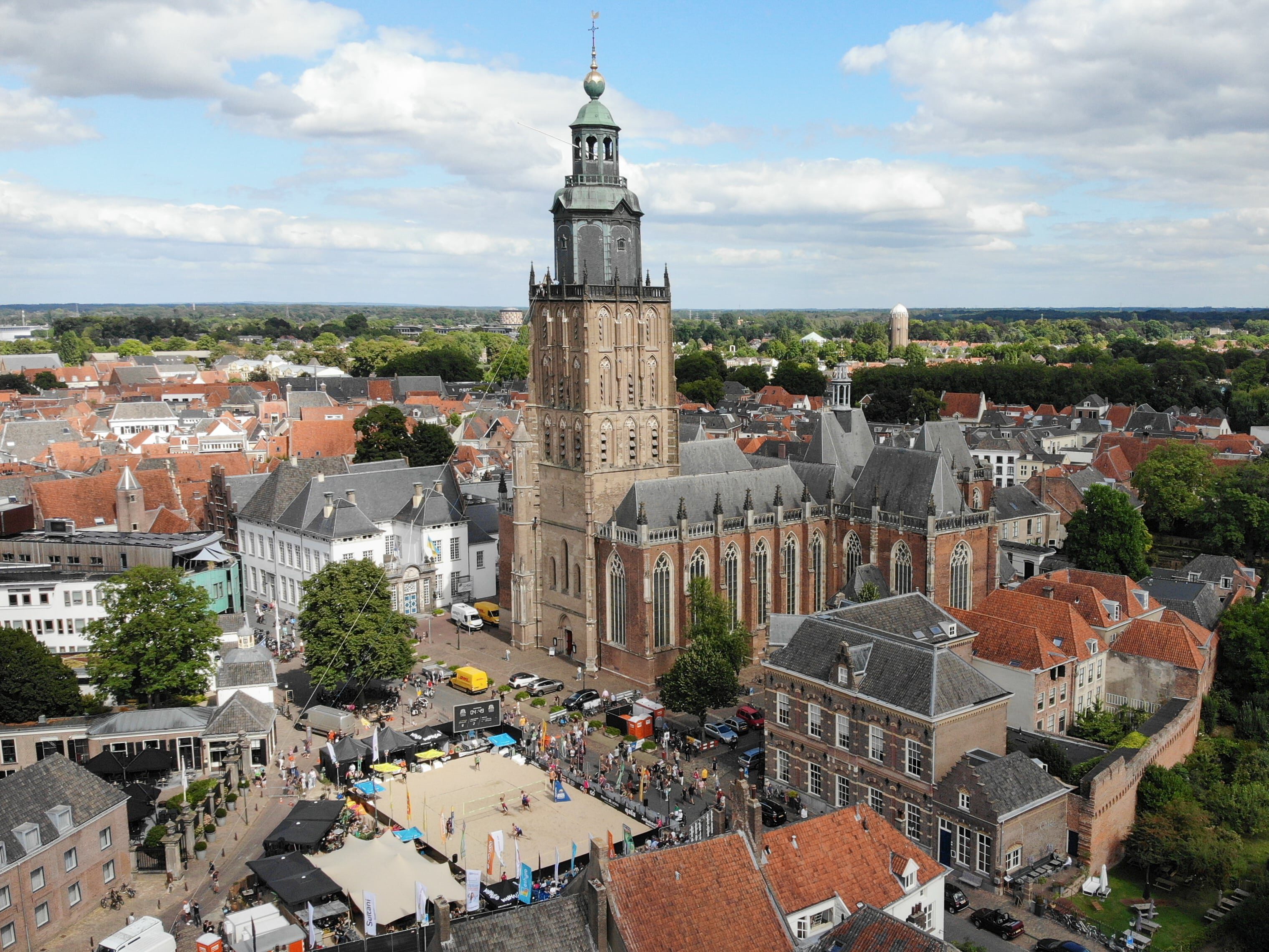 Dat Zutphen een fantastische locatie kent om te beachvolleyballen werd maar eens te meer duidelijk dit weekend. Op de Groenmarkt, pal naast de Wijnhuistoren, werd het publiek getrakteerd op prachtig weer en mooi beachvolleybal van de Nederlandse top. De terrassen rondom en de tribunes aan weerszijden zorgden bovendien voor een gezellige sfeer. Met als letterlijk hoogtepunt het brengen van de wedstrijdbal in de herenfinale door Katja Stam, al tokkelend van de kerktoren.