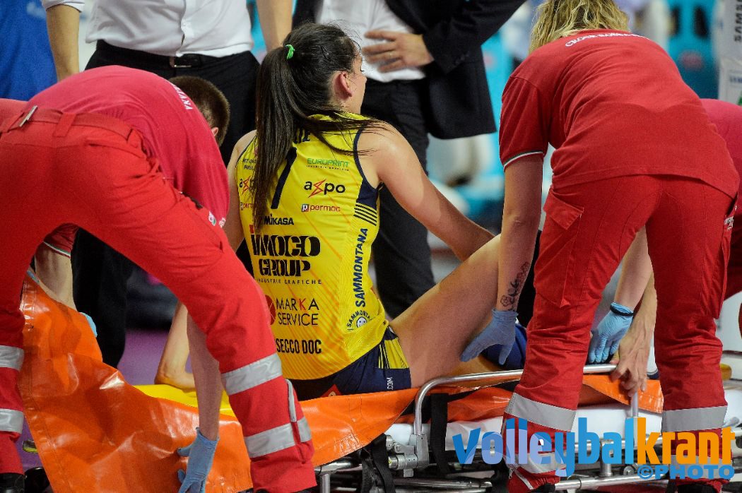 Al vroeg in de tweede set moest het spel worden stil gelegd bij een blessure van Folie. De ongelukkige middenaanvalster, die een groot deel van dit seizoen al moest missen door een blessure, zakte door haar knie na een aanval en ging schreeuwend naar de grond. Speelsters van beide teams stonden met tranen in de ogen, terwijl Folie op een brancard van het veld gedragen werd. De wedstrijd moest daarna doorgaan en Conegliano wist een gaatje van een paar punten te slaan. Op 19-24 besliste een killblock ook de tweede set in het voordeel van de gasten. Ook in set drie pakt Conegliano halverwege een kleine voorsprong, die bij de big points nog steeds op het scorebord stond. Ook die derde set ging met 19-25 naar Conegliano en het team van coach Santarelli won daarmee de wedstrijd met 0-3 en staat nu op voorsprong.