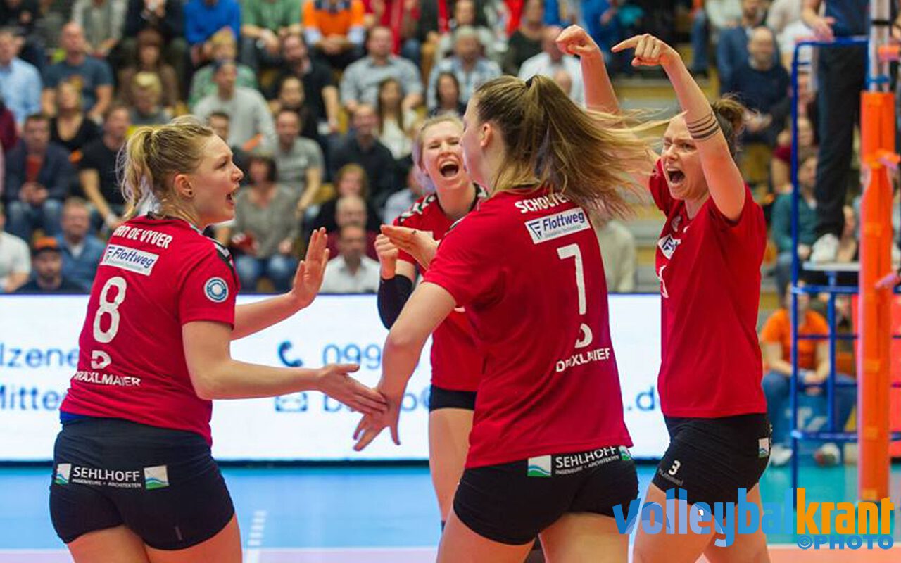 Het was een pittige week voor Rote Raben Vilsbiburg, met maar liefst 3 wedstrijden in 4 dagen. Doordeweeks verloor het team van Myrthe Schoot en Iris Scholten nog van Münster met 3-0, dit weekend werden er twee zeges geboekt. Op zaterdag was er de zwaarbevochten zege in de uitwedstrijd tegen Potsdam. Vilsbiburg kwam twee keer op voorsprong, maar zag de thuisploeg ook twee keer langszij komen. Uiteindelijk maakte Rote Raben aanvallend het verschil en werd de vijfde set met 13-15 gewonnen. Scholten scoorde 11 keer, Schoot speelde ook de hele wedstrijd.