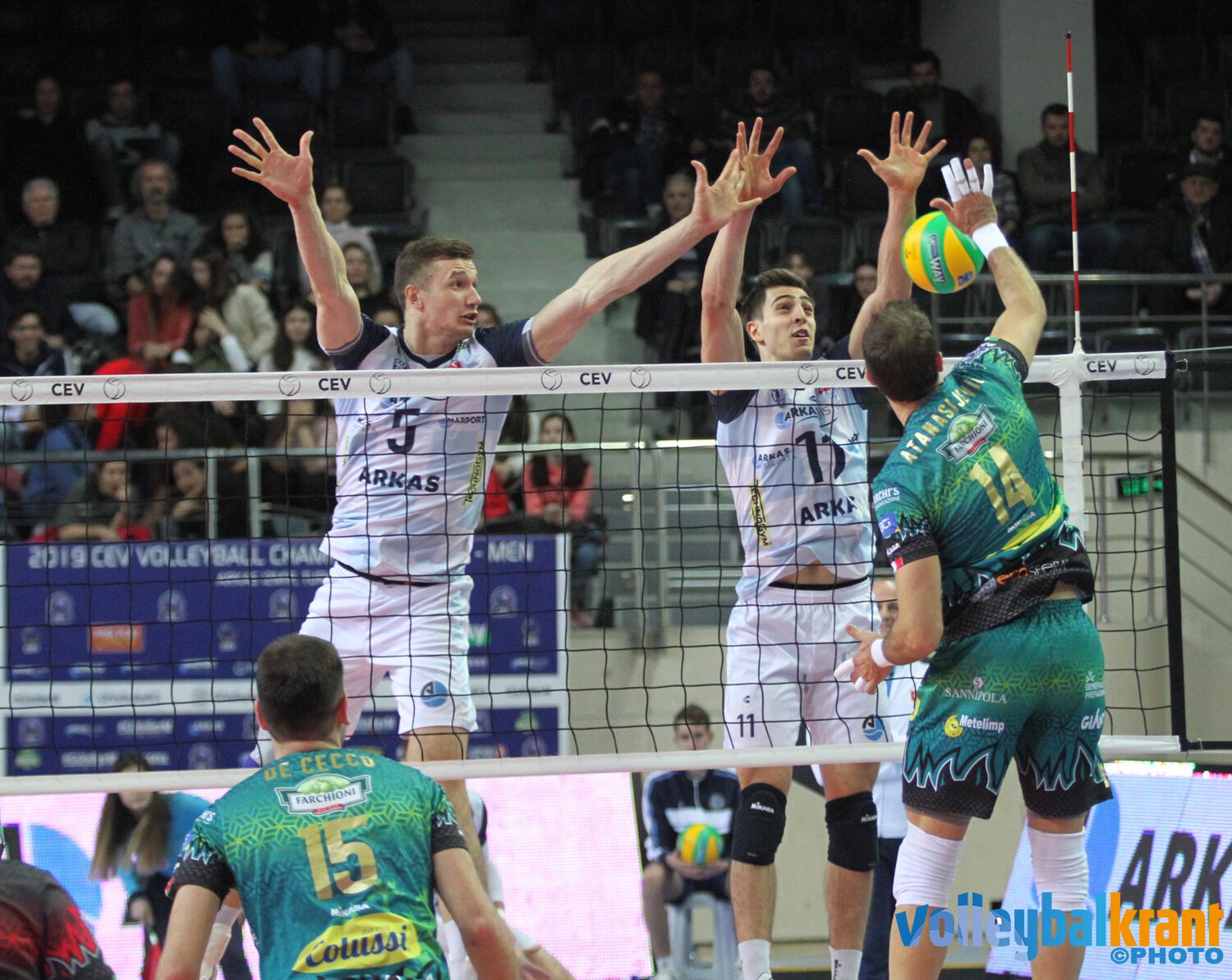 Perugia leek in Poule E geen kind te hebben aan Arkas Izmir, op bezoek in Turkije wonnen de Italianen (waar Sjoerd Hoogendoorn de gehele wedstrijd aan de kant bleef) de openingsset 25-10. De tweede ging met 25-19 naar de bronzen medaillewinnaar van 2018 in de Champions League. Daarna richtte Izmir zich op, vooral de Est Robert Täht liet van zich horen in de aanval en vanaf de servicelijn. De derde set werd door de Turkse ploeg gepakt met 25-22. Toch trok Perugia aan het langste eind, zakelijk maakte de ploeg van coach Lorenzo Bernardi het met 25-23 af.