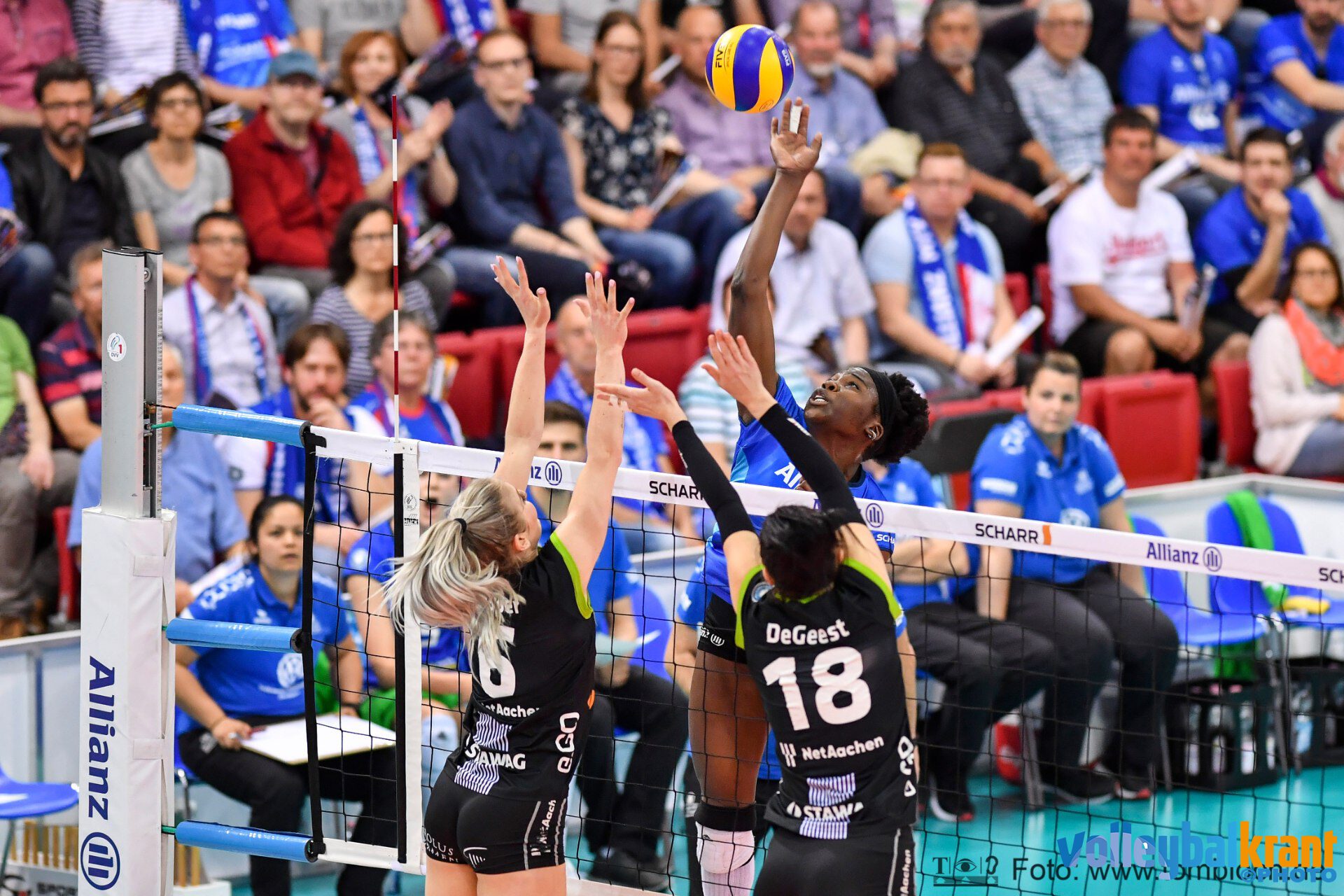 Schwerin had er al twee lastige wedstrijden op zitten tegen Potsdam, maar in het derde duel was het alleen in de eerste set spannend. Na de 29-27 was het verzet van de gasten gebroken en werd het via 25-16 en 25-18 een zege voor de thuisploeg. Vooral blokkerend en aanvallend had Schwerin het goed voor elkaar. Er was amper speeltijd weggelegd voor de Nederlandse internationals, alleen Bongaerts kwam in de derde set aan het eind even binnen de lijnen.