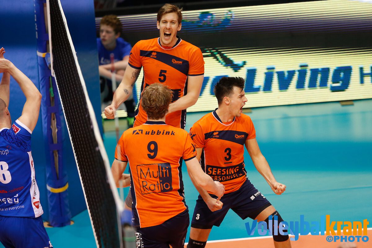 In de vierde set sloeg Orion een gat van vijf punten, met name dankzij uitstekend serveerwerk van Pim Kamps en Stijn Held. Het derde matchpoint werd benut doordat Wytze Kooistra, die de hele wedstrijd veel had gescoord, de bal in het net serveerde (25-20).