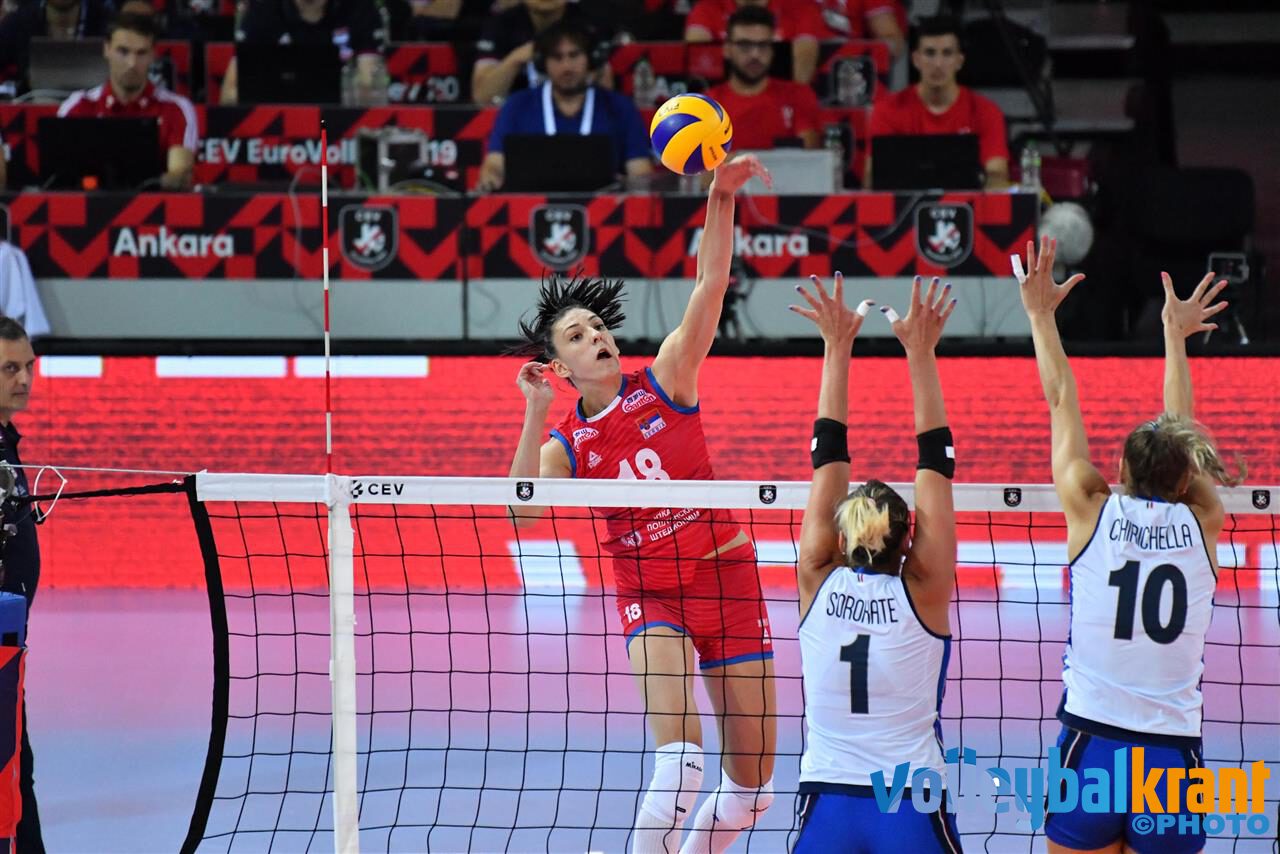 In de andere halve finale troffen de ploegen elkaar die op het laatste WK streden om de gouden medaille. In een vijf sets durende thriller trok Servië toen aan het langste eind. In de halve finale van het EK had Servië minder moeite met de ploeg van superster Paola Egonu. Waar Servië aanvallend met 49 punten de betere ploeg was, wist Italiëin de blokkering het meest te scoren (12). Het was vooraf bestempeld als de strijd tussen Paola Egonu en Tijana Boskovic. Boskovic scoorde in de aanval 19 directe punten. Egonu kwam tot 18 punten, maar wist daar in de blokkering nog eens 5 punten aan toe te voegen.