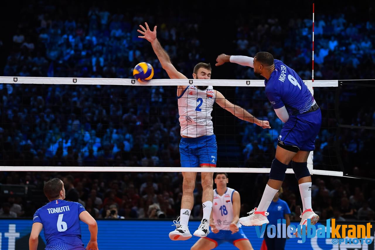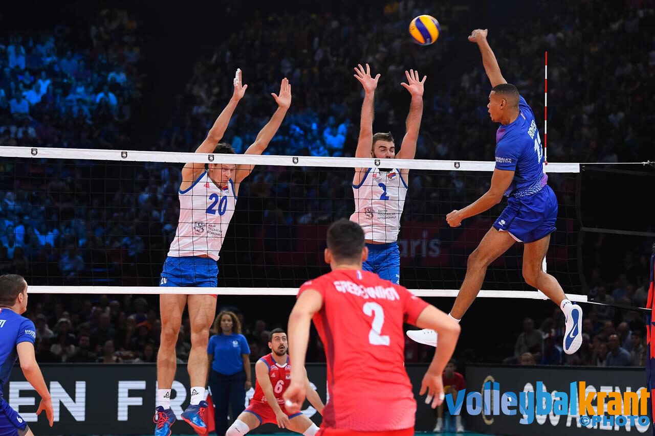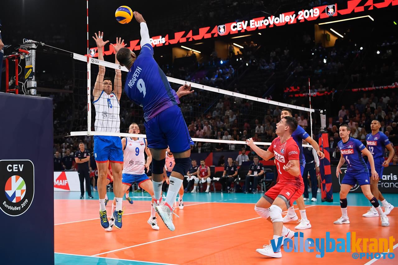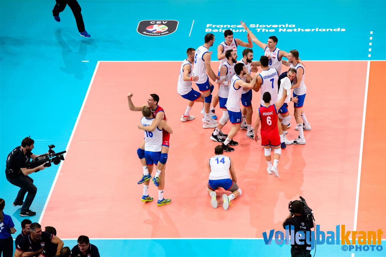 De Servische mannen hebben op het EK de halve finale gewonnen van Frankrijk. Onder toeziend oog van 12.500 Fransen in Parijs wist Servië in vijf sets te winnen. (23-25, 25-23, 25-21, 17-25, 15-7)