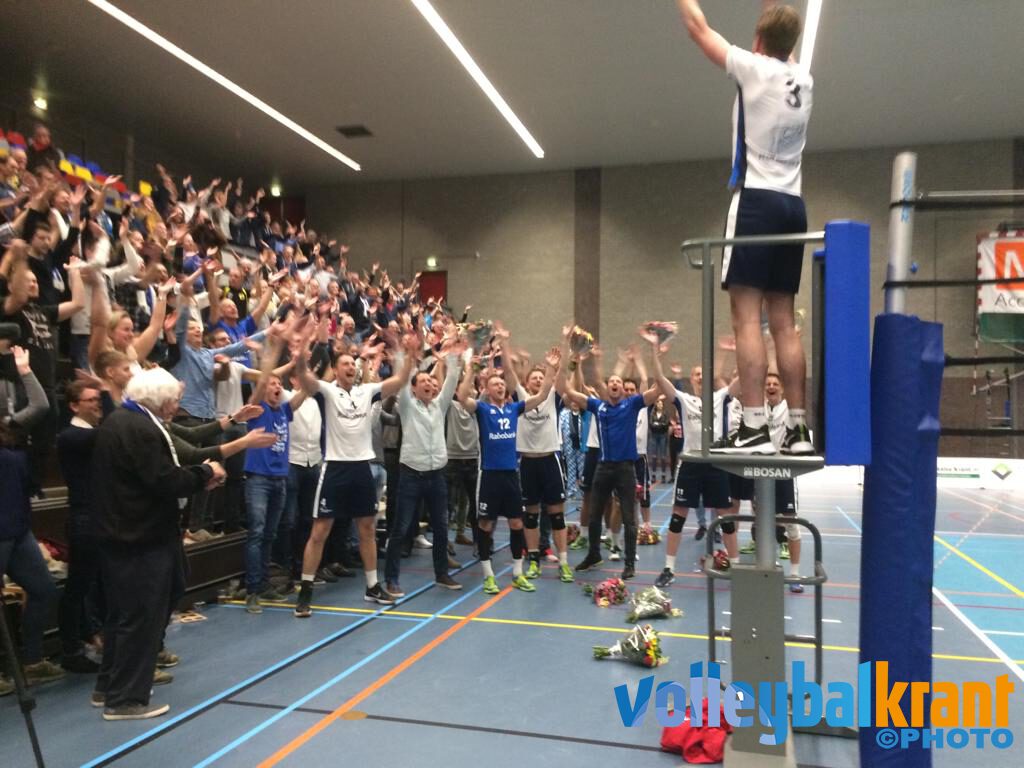 In Veenendaal waren de tribunes vol met supporters uit Sliedrecht en na het laatste beslissende punt van de koploper barstte het feest in alle hevigheid los. De eerste set ging redelijk eenvoudig naar Sliedrecht, maar in de tweede set vocht MKB Accountants/VCV sterk terug en leek even een verrassing in de maak. Spannend werd het echter niet, want de laatste twee sets won Sliedrecht met overmacht, waarna het feest gevierd kon worden.