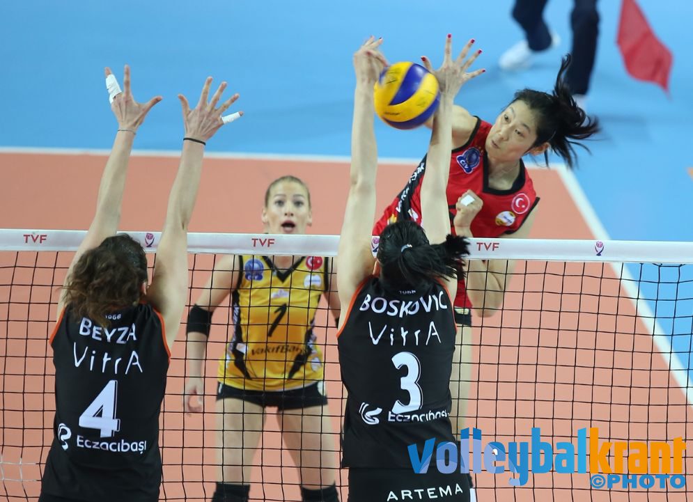 Zhu Ting werd topscoorster met 25 punten en een aanvalspercentage van 63%. Sloetjes speelde ook een verdienstelijke wedstrijd en kwam tot 12 scores. Voor Eczacibasi was Boskovic de enige die echt goed tot scoren kwam (17 punten). Blokkerend (9 om 3) en aanvallend (43 om 35) had de thuisploeg het beter voor elkaar.