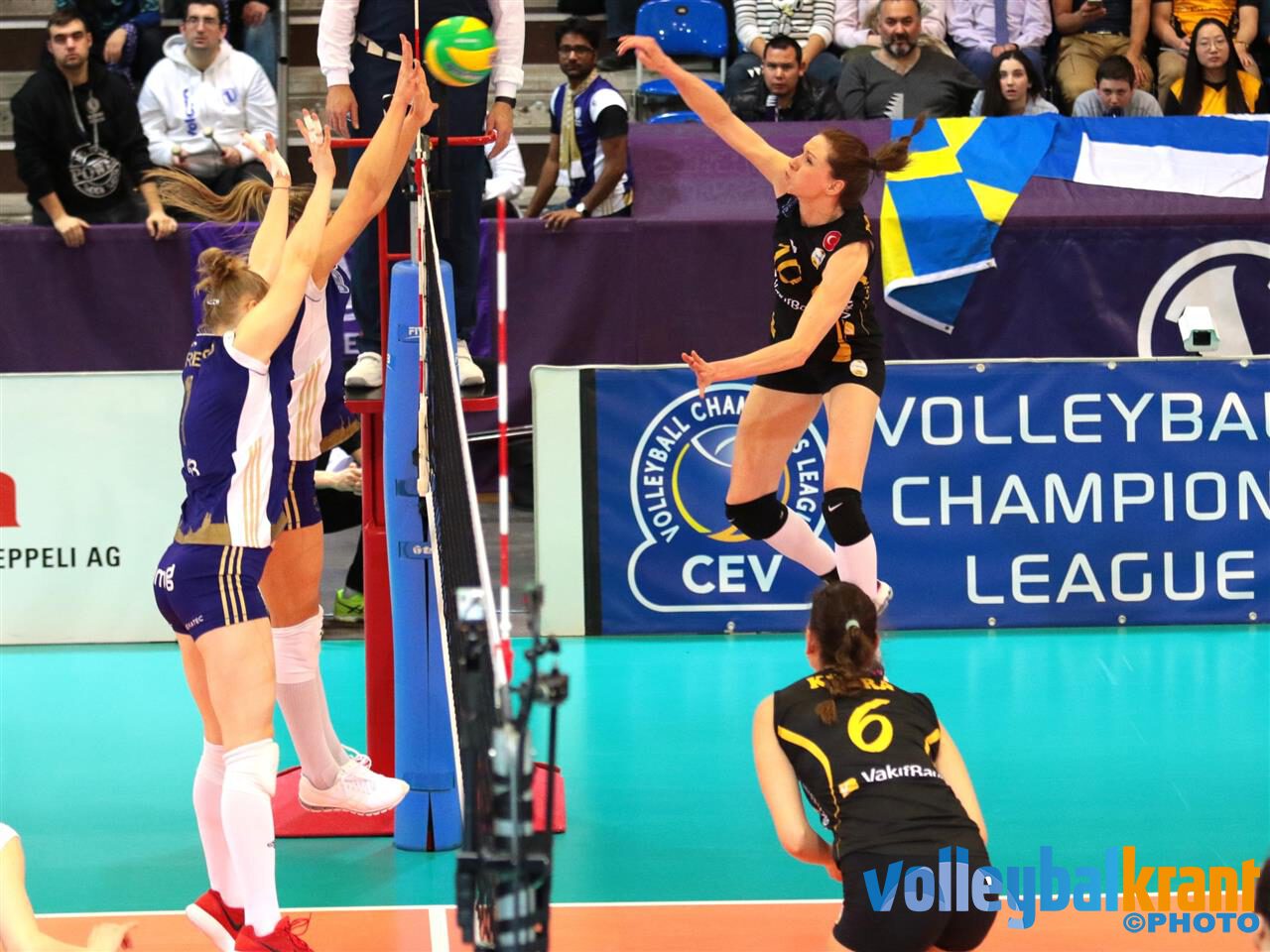 Ook dit jaar is Vakifbank weer de favoriet voor het winnen van de Champions League en de club uit Istanbul liet gisteren weer zien waarom. In een goedgevulde en sfeervolle hal, die dit seizoen voor het laatst wordt gebruikt als thuisbasis voor Voléro, namen de gasten al snel een voorsprong om die uit te breiden naar een gat van tien punten (11-21). Goed blokkerend en aanvallend werk van voornamelijk Sloetjes en Rasic zette Vakifbank al gauw op een 0-1 voorsprong (17-25). Ook in set twee had de Turkse ploeg al snel een gaatje geslagen. Hoewel de thuisploeg, onder leiding van Avital Selinger, nog wel dichterbij kwam lukte het niet om langszij te komen (22-25). Set drie gaf een zelfde spelbeeld, Vakifbank slaat een gat en de Zwitserse ploeg lukt het niet om dat te dichten. De Amerikaanse Kelsey Robinson, in de ploeg gekomen voor captain Kirdar, scoort in die set gelijk 5 van haar 5 aanvallen. Uiteindelijk is de laatste set met 21-25 voor Vakifbank, dat met die 0-3 zege voor een goede uitgangspositie heeft gezorgd. Lonneke Sloetjes en Zhu Ting deelden de topscoorderstitel voor Vakifbank met beide 14 punten, Milena Rasic blonk uit met 5 killblocks.
