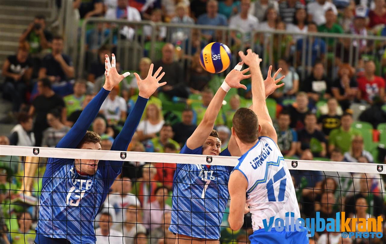 De Slovenen kwamen vervolgens is set twee als een raket uit de startblokken en keken de gehele set geen één keer tegen een achterstand aan. Met Urnaut, Cebulj en Gasparini scoorde de Slovenen er lustig op los. Rusland kon alleen in set drie echt een vuist maken. Voor Rusland kwamen Poletaev en Kliuka veelvuldig tot scoren, maar bleven andere grote namen zoals Muserskiy en Volkov behoorlijk achter. De Russische opleving was van korte duur. In set vier trok Slovenië de teugels weer aan. De ontketende thuisploeg nam halverwege de set afstand en op 24-21 sloeg diagonaal Gasparini zijn team naar de halve finale.