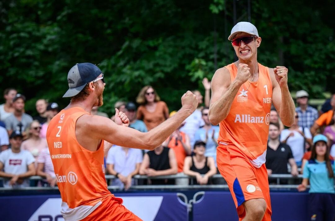 Werkhoven/Van de Velde Het tweede succes van de dag kwam van Mart van Werkhoven en Steven van de Velde. Na een tweede plek in de poule trof het vandaag het Italiaanse duo Lupo/Ranghieri. De Nederlanders schoten uitstekend uit de startblokken. Italië kreeg geen grip op de side-out van Werkhoven/Van de Velde en via 21-12 was de eerste set een prooi voor Nederland. De vele mensen die kwamen kijken op veld 1 kregen een mooie tweede set te zien. Na wederom een sterk begin van Nederland knokte Italië zich terug. Aan het einde was het spannend en beide teams kregen setpunten. Uiteindelijk was het Van de Velde die op 21-20 de bal van Lupo doorhad, en het karwei afmaakte. Morgen spelen Mart en Steven tegen de kersverse winnaars van de laatste Elite 16 Bryl en Losiak uit Polen.