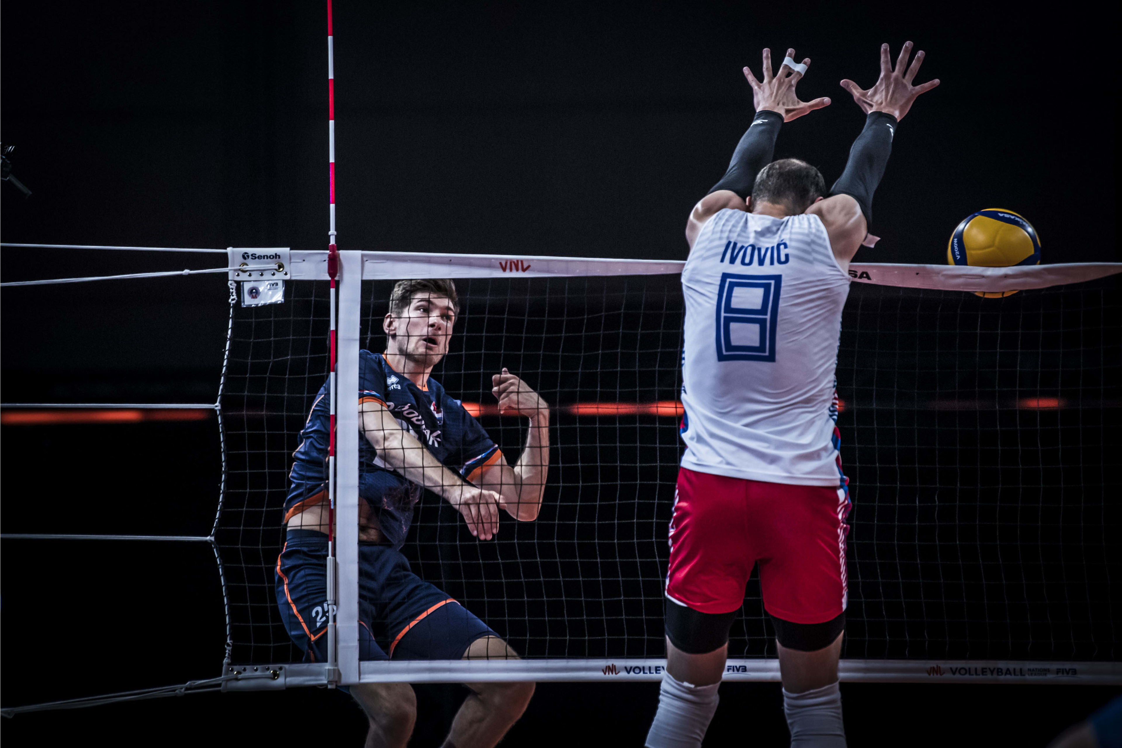 Daarin leek het even helemaal mis te gaan. In de welbekende rotatie één kreeg het moeilijke services te verwerken en opeens stond er een 1-6 achterstand op het scoreboard. Het was Ter Horst die met meerdere punten Oranje in de race hield (6-9). Het kantelmoment was de dubbele wissel met Freek de Weijer en Stijn van Schie. De Weijer speelde Van Schie meteen vrij. Na dit mooie punt pakte Van Schie een hard blokpunt op de Servische topscorer Luburic en Nederland begon te geloven in een overwinning. De dubbele wissel werd op het goede moment terug gewisseld, want het was Keemink die een harde klap van de grond haalde. Via de tegenaanval van Andringa werd het 12-12. De eerste twee matchpoints werden nog weggewerkt door Ter Horst en Andringa, maar helaas was het derde Servische wedstrijdpunt toch raak. Via 15-17 ging de vijfde set net verloren en zo blijft Nederland op twee overwinningen steken.