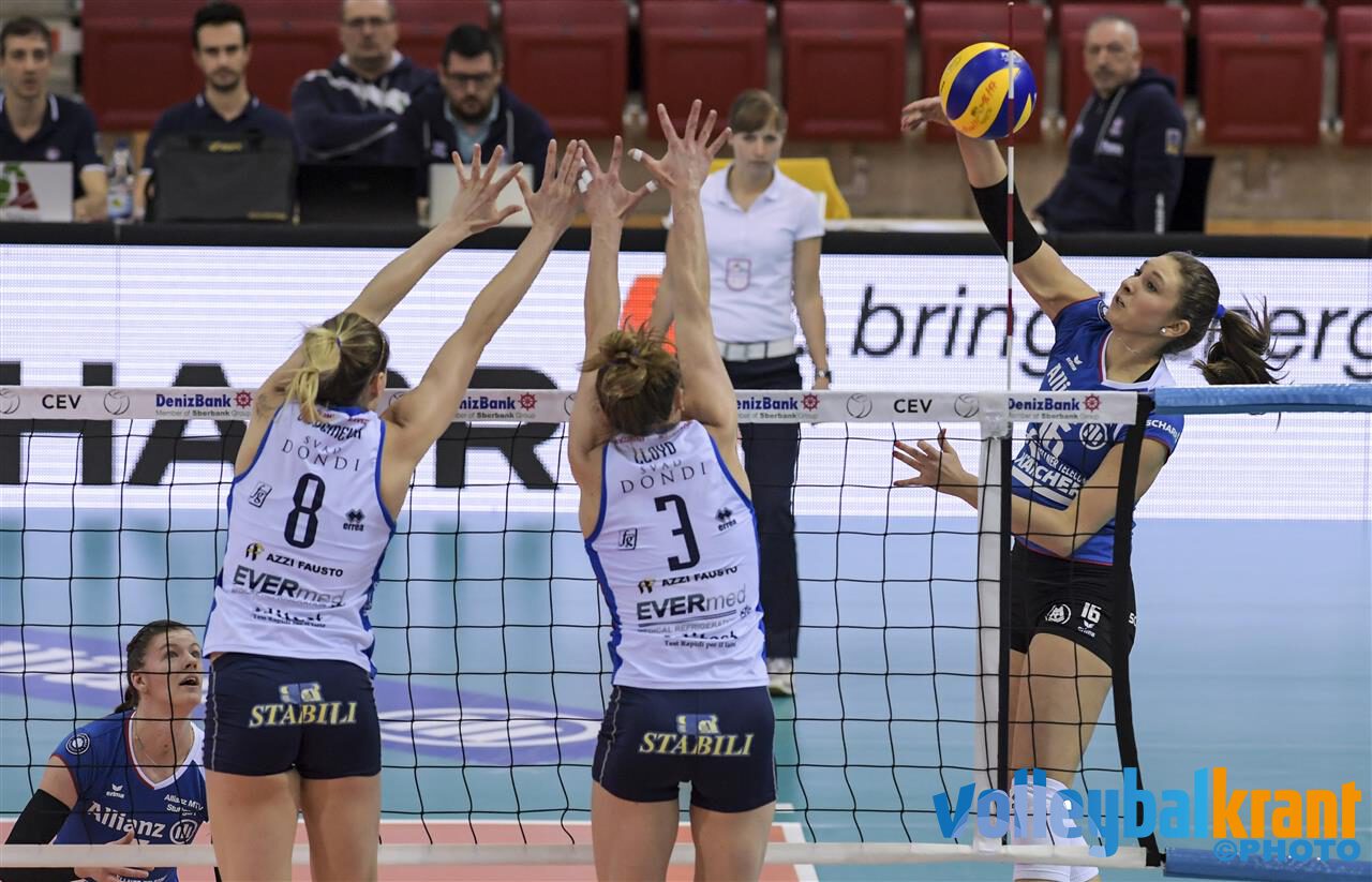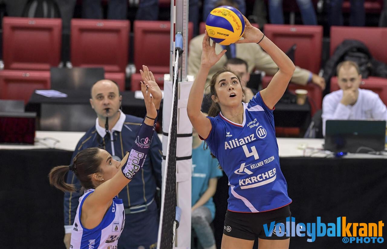 De Duitse ploeg kwam thuis tegen het zeer ervaren Italiaanse Casalmaggiore, winnaar van de Champions League vorig jaar, op een 2-0 achterstand, via twee keer 25-19. Maar toen zette de Duitse ploeg de vechtmodus aan, met de pas 20-jarige Tsjechische Michaela Mlejnkova in de hoofdrol (24 punten). Door twee sets (25-22, 25-21) op rij te winnen, leek een sensatie in de maak. In de dolenthousiaste Scharrena in Stuttgart ging de thuiploeg door en nam een 7-2 voorsprong in de tiebreak. Maar uiteindelijk wist de Italiaanse ploeg onder aanvoering van routinier Carmen Turlea (26 punten), zich alsnog te herpakken om er met de zege vandoor te gaan via een 15-12 setzege. Deborah van Daelen viel in alle sets in en scoorde 7 punten. Kim Renkema kwam niet in actie. De return is over een week.
