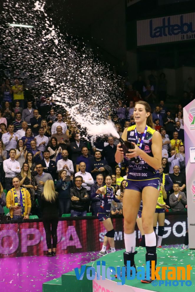 Het leek er in de vierde set op dat Novara er nog een vijfde set uit zou kunnen halen, want de ploeg van Barbolini stond tot halverwege continue voor. Conegliano deed de wedstrijd echter doen kantelen door vanaf 14-16 een inhaalslag te maken. Bij de 'big points' stond het 21-19 voor de landskampioen dat die voorsprong niet meer weg zou geven. Op 24-23 stond het matchpoint op de scoreborden, een aanval van Sylla bracht de beslissing. Zodoende is de eerste prijs van het seizoen voor Conegliano. Robin de Kruijf speelde de hele wedstrijd en scoorde 11 keer, waarvan 4 killblocks en 2 keer uit de service. Celeste Plak kreeg geen speeltijd.