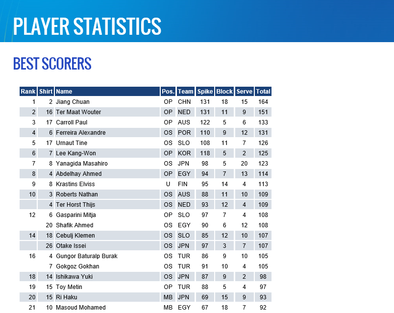 Met een totaal van 151 punten staat Wouter ter Maat voorlopig tweede in het klassement van topscorers van groep twee van de World League. De Nederlandse diagonaalspeler - die flink in vorm is - vindt alleen de Chinees Jiang Chuan boven zich.