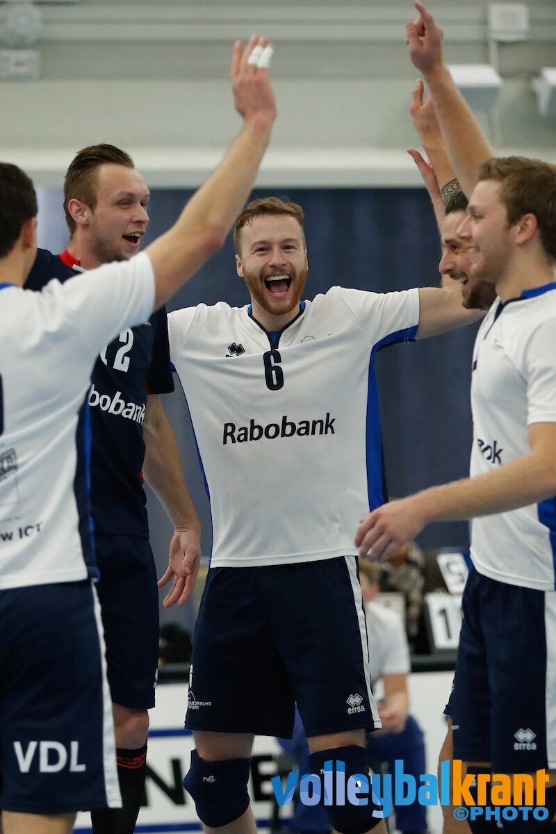 Ook de andere koploper wist de volle drie punten te pakken. In sporthal De Basis was Sliedrecht Sport een maatje te groot voor SV Land Taurus. Onder toeziend oog van NOS-sportverslaggever Maarten Tip, die via korte flitsen verslag deed op de radio, won de verrassende debutant met klinkende cijfers.