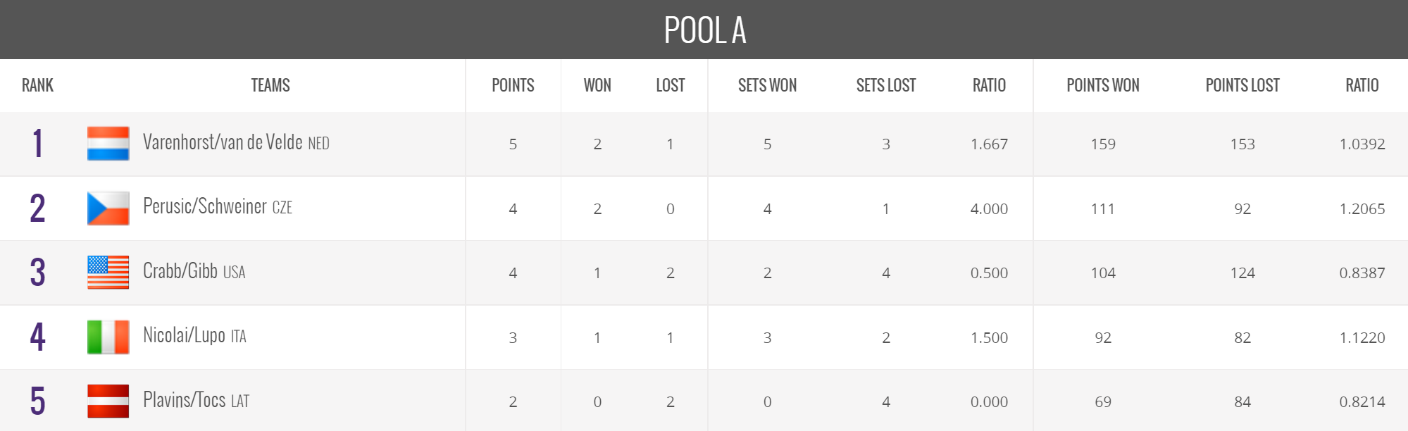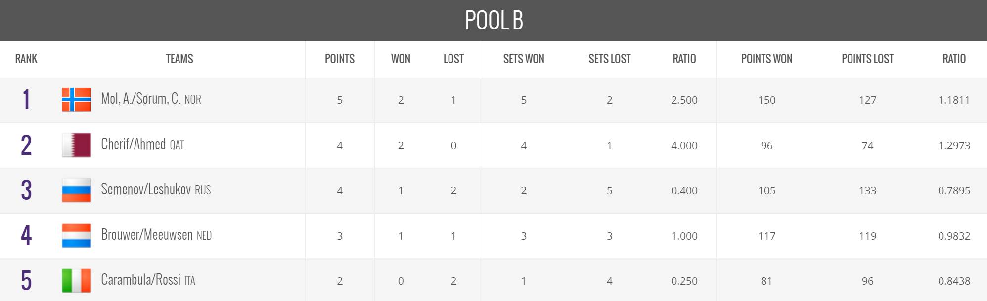Vandaag lieten de Varenhorst en Van de Velde zien in goede fysieke vorm te steken, want Crabb/Gibb uit Amerika werd met 2-0 (26-24 en 21-10) verslagen en zo gaan de Nederlanders (met weliswaar een wedstrijd meer) in Poule A aan kop. Brouwer en Meeuwsen boekten vandaag een uiterst knappe, maar vooral belangrijke overwinning op Olympisch kampioen Mol/Sorum uit Noorwegen. Ook deze wedstrijd was razend spannend. Waar het er tot twee keer toe op leek dat Nederland de overwinning uit handen zou geven, lukten het Alexander en Robert toch om de sterke Noren te verslaan (21-19, 23-25 en 24-22 (!)). In poule B staan ze momenteel vierde van de vijf teams, maar de mannen hebben nog een wedstrijd te goed. Wel zal er morgen tegen Ahmed/Cherif (Qatar) en Carambula/Rossi (Italië) gepresteerd moeten worden om in ieder geval derde in de poule te worden.